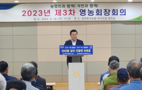 [광양] 유경열 대표기자=광양동부농협 영농회장회의에 부산 금정농협 송영조 조합장 특강 펼쳐 - 광양동부농협 영농회장회의에 부산 금정농협 송영조 조합장 특강 펼쳐 - 도농복합농협 지역에서 직접 농사짓는 송 조합장 강의에 열광 광양동부농협 영농회장회의에 부산 금정농협 송영조..... 2023-09-22