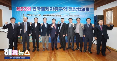 [광양경자청] 제33회 전국경제자유구역 청장협의회 개최 광양만권경제자유구역청(청장 구충곤, 이하 광양경자청)은 11월 4일 순천만 에코촌 생태관에서 ‘제33회 전국경제자유구역 청장협의회’를 주관해 개최했다고 밝혔다. 왼쪽부터 최복수 충..... 2025-11-04