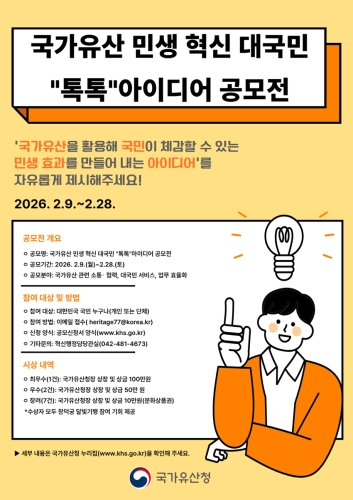 [국가유산청] ‘국가유산 민생 혁신 대국민 “톡톡” 아이디어 공모전’ 개최 자료제공=국가유산청 국가유산청(청장 허민)은 2월 9일부터 2월 28일까지 국가유산을 활용해 국민 삶의 질을 높이는 민생형 정책을 발굴하기 위한 「국가유산 민생 혁신 대국민 “톡톡..... 2026-02-25