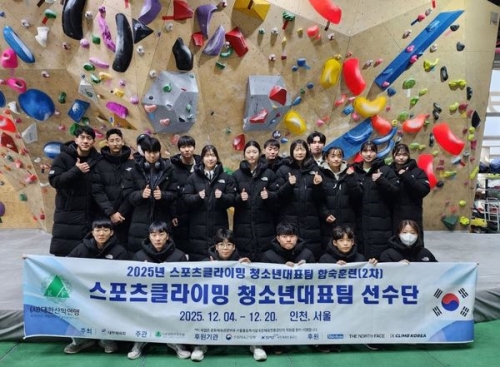 스포츠클라이밍 청소년대표팀, 12월 동계 합숙훈련 실시 스포츠클라이밍 청소년 대표팀 선수단 단체사진. (제공= 대한산악연맹) 사단법인 대한산악연맹(회장 조좌진)은 2026 시즌을 대비해 '2025년도 스포츠클라이밍 청소년대표팀 2차 합..... 2025-12-23