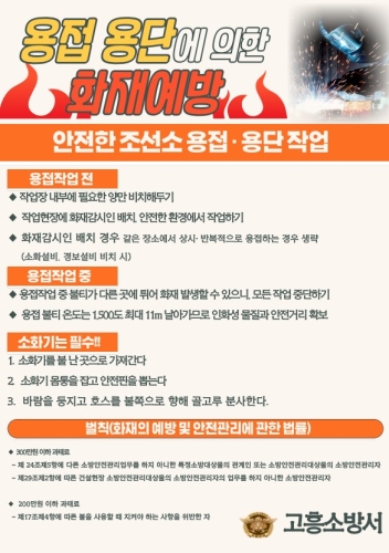 고흥소방서, 건설현장 용접ㆍ용단 안전수칙 안내 사진 설명 고흥소방서(서장 서승호)는 건설현장 용접ㆍ용단 작업 시 불티로 인해 발생할 수 있는 화재 예방과 안전수칙 준수를 당부한다고 1일 말했다. 건설현장 내에는 다량의 유독가스..... 2024-05-01