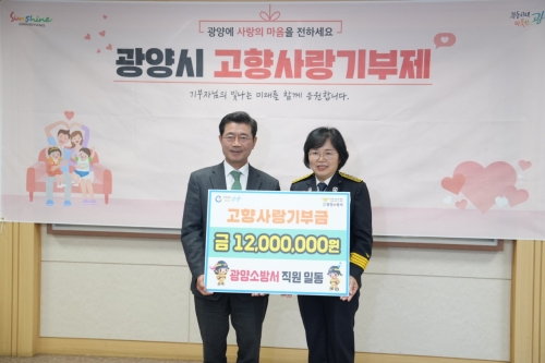 상생 협력을위한 광양소방서 고향사랑기부금 1,200만원 기탁 [해륙뉴스1]=서정민기자.광양소방서(서장 정강옥)은 4월5일. 직원 117명의 소중한 마음을 담은 고향사랑기부금 1,200만원을 광양시에 전달했다고 밝혔다. 고향사랑기부제는 건전한..... 2024-04-06