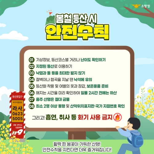고흥소방서, 등산 활동 안전사고 주의 당부 사진 설명 고흥소방서(서장 서승호)는 기온이 상승하는 봄철 등산객 급증에 대비해 산악사고 안전수칙 홍보에 나선다고 23일 말했다. 산악사고 원인의 대다수는 부주의에서 일어난다. 즐..... 2024-04-23