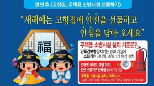 고흥소방서, 설 명절 고향집 주택용 소방시설 선물하기 집중홍보 사진 설명 고흥소방서(서장 서승호)는 설 명절을 맞아 주택화재 인명피해 저감 및 안전문화 조성을 위한 ‘고향집 주택용 소방시설 선물하기’ 집중 홍보에 나섰다. 주택용 소방시설은 소..... 2024-01-31