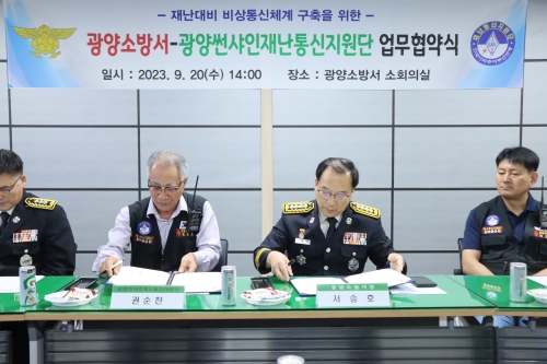 광양소방서.광양썬샤인 재난통신지원단 비상통신체계 구축 MOU체결 [해륙뉴스1=서정민기자.광양소방서(서장 서승호)는 지난 20일, 한국아마추어무선연맹 전남본부 광양썬샤인재난통신지원단과 천재지변, 인명구조𐩐구호 등 재난상황 시 비상통신체계 구축을..... 2023-09-20