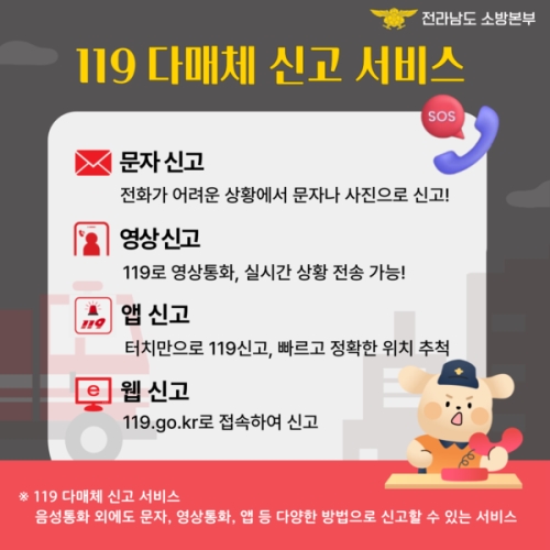 고흥소방서, 119다매체 신고서비스 적극 활용 홍보 고흥소방서(서장 서승호)는 긴급상황 발생 시 음성통화 외에도 문자, 애플리케이션(앱), 영상통화를 이용하여 신고가 가능한 119다매체 신고 서비스를 안내한다고 25일 밝혔다. ‘1..... 2025-06-25