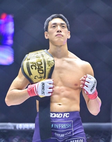 로드FC 웰터급 초대 챔피언 오른 윤태영(29·제주 팀더킹) 윤태영(29·제주) 웰터급 타이틀전에서 승리한 윤태영이 챔피언 벨트를 들고 포즈를 취하고 있다 로드FC가 7일 장충체육관에서 2025년 마지막 넘버시리즈인 ‘굽네 로드FC 075’..... 2025-12-10