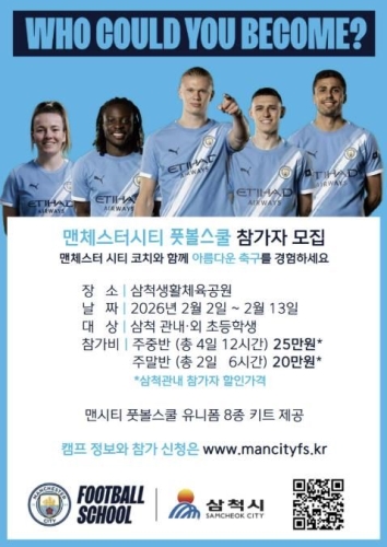 삼척시, 세계적인 맨체스터시티 풋볼 스쿨 유치로 유소년 축구 교육 강화 삼척시는 ‘맨체스터 시티 풋볼 스쿨(MCFS)’ 겨울 캠프를 운영한다. 맨체스터 시티 FC와 삼척시가 함께 추진하는 MCFS 삼척 프로그램은 세계적 수준의 축구 교육 철학을 지역 ..... 2026-01-09