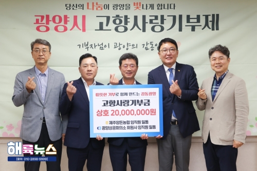 [광양상공회의소] 제주양돈농협, 고향사랑기부제 교차기부금 2,000만원 전달 광양상공회의소(회장 우광일)는 9월 9일(화) 제주양돈농협 고권진 조합장이 광양시청을 방문해 고향사랑기부제 교차기부금 2,000만원을 전달하였다고 밝혔다. 제주양돈농협 고향사랑 기..... 2025-09-10