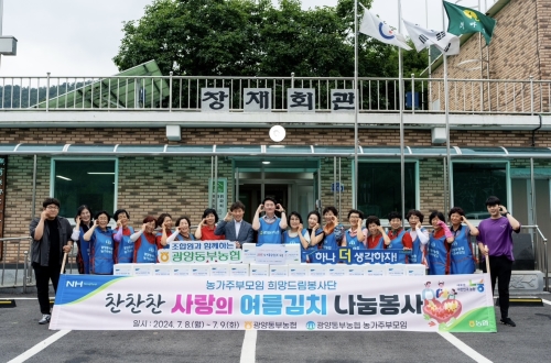 [광양] 유경열 대표기자=관내 마을회관에 광양동부농협과 농가주부모임이 함께 사랑의 여름김치 나눔행사로 타 단체에 큰 귀감되다.. 광양동부농협(조합장 문정태)과 농가주부모임은 조합원과 지역민들을 위한 ‘찬찬찬 사랑의 여름김치 나눔행사’를 펼쳤다. 광양동부농협 임직원과 농가주부모임 회원들의 기념사진 (사진=동부..... 2024-07-09