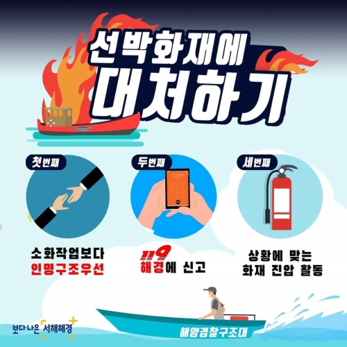 서해해경ㆍ선박 화재시대처요령 🔥치솟는 불길 속🔥 🌊배 한 척 보이지 않는 바다에서🌊 😱불이난다면?!😱 . 소화기로 불을 끈다? 🤔 바닷물을 퍼서 부어버린다? 🤔 . 규모가 작은 화재에는 소화기나..... 2020-10-05