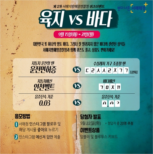 서해해경청 해양안전 퀴즈 이벤트에 많이 참여해주세요 -21일까지 SNS 인스타그램 통해 실시…정답자 추첨 블루투스 키보드 등 지급- 서해지방해양경찰청(청장 김도준)이 해양안전문화 확산과 대국민 소통활성화를 위해 SNS 해양안전 퀴즈..... 2020-09-15