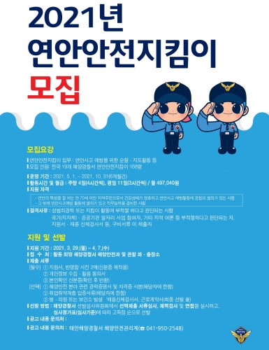 태안해경,유급 연안안전 지킴이 정식운영 10명 모집 - 노령 일자리 정부시책 연계, 민·관 협업의 연안사고 예방체계 강화 기대 - 충남 태안해양경찰서(서장 윤태연)는 연안사고 예방 강화를 위해 오는 4월 15일까지 유급 ‘연안안전 ..... 2021-03-30