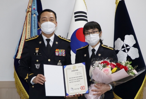 군산해경 최수정 경위, 모범공무원 증서 수여 모범공무원에 선발된 최수정경위가 김충관 군산해양경찰서 서장과 기념촬영을 하고 있다 / 자료 - 군산해양경찰서 군산해양경찰서(서장 김충관)는 지난 3일 ‘2021년 하반기 모범 공무..... 2022-01-04