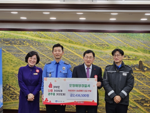 [포항해경]김성필 본부장= ‘24년도 36.5℃ 따뜻한 온기를 이웃에게 - 직원 일동의 마음 담아 경주시에 2,436,500원 전달 포항해양경찰서(성대훈 서장)는 경주시에 성금 2,436,500원을 전달했다고 밝혔다. 이번 성금은 포항해경 577명이 ..... 2023-12-12
