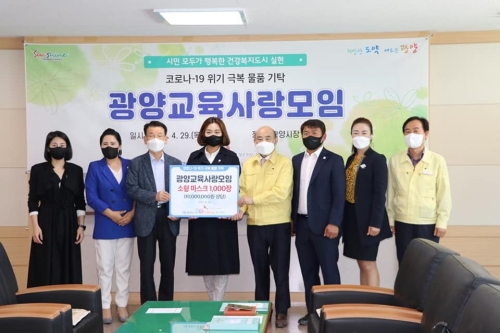 광양교육사랑모임, 어린이집연합회에 마스크 기탁 사진 설명 광양시는 지난 29일 광양교육사랑모임에서 코로나19 위기 극복 및 감염 예방을 위해 나노구리 항균마스크 1,000장을 광양시사랑나눔복지재단에 기탁했다. 기탁식에는 정현복..... 2021-05-01