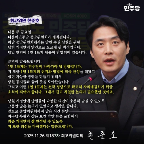 제187차 최고위원회의… 한준호 의원 “1인 1표제는 민주당이 가야 할 길, 당원주권 강화의 초석” 출처: 한준호최고위원 페이스북 더불어민주당 한준호 최고위원이 제187차 최고위원회의에서 이재명 대통령의 7박 10일 중동·아프리카 순방 성과와 향후 당헌 개정 논의의 방향을 차분하..... 2025-11-27