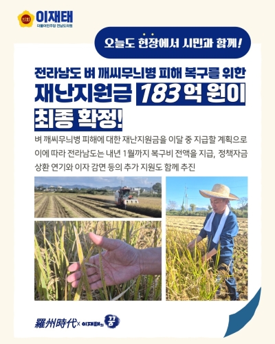 ‘말보다 실천’… 이재태 도의원, 전남도민에 현실적인 크리스마스 선물 사진제공 이재태 의원 [해륙뉴스1 정치부 조경수기자]전라남도 벼 깨씨무늬병 피해 농가를 위한 재난지원금 183억 원이 최종 확정되며, 연말을 앞둔 전남도민들에게 의미 있는 크리스마..... 2025-12-18