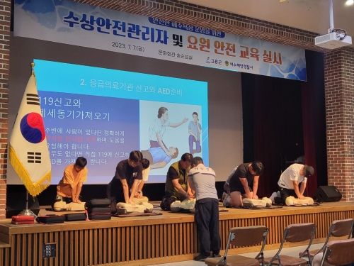 여수해경, 해수욕장 민간 안전관리 요원 교육에 나서 여수해경이 심폐소생술을 교육 중이다(사진=여수해경) [해륙뉴스1]김동환기자=여수해양경찰서(서장 고민관)는 “여름 피서철을 맞아 고흥 관내 해수욕장 개장 전 민간 안전관리 요원에 대..... 2023-07-07
