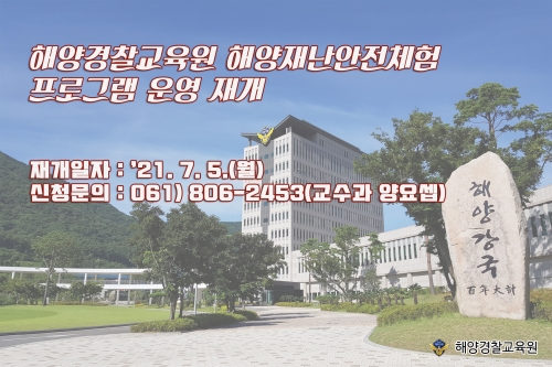 해양경찰교육원, ‵해양재난 안전체험 프로그램′운영 재개 -해양재난대응실습장에서 선박사고·연안사고 대응요령과 응급처지술 등 체험- 해양경찰교육원(원장 김성종)은 코로나-19 지역사회 확산 방지를 위해 지난해 3월 이후 잠정 중단되었던 ‵..... 2021-06-23