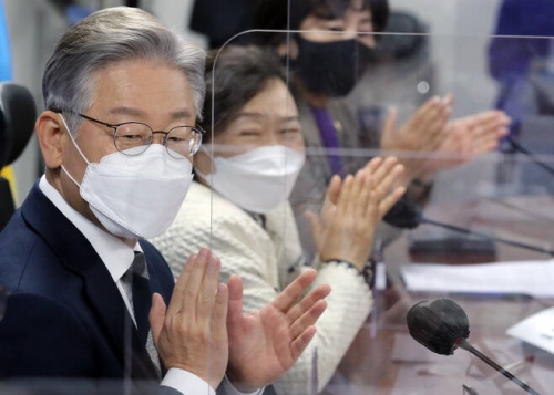 원팀! 이재명 [전국민 지원금] 카드 오픈! 이재명 더불어민주당 대선 후보가 29일 오전 국회 의원회관에서 열린 '단계적 일상회복 점검 간담회'에서 참석자들과 함께 손뼉을 치고 있다. [사진/연합뉴스-제공] 이재명 더불어민주..... 2021-10-29