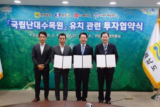 전라남도와 완도군은 4일 전남도청에서 ㈜영무토건, ㈜여수예술랜드와 국립난대수목원 유치와 관련해 완도군 관광휴양시설 구축의 일환으로 리조트 및 호텔 건립 투자 협약을 체결했다.