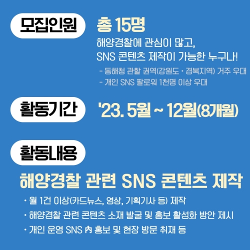 - 동해해경청, 오는 23일까지 2023년도 국민기자단 모집 - 동해지방해양경찰청(청장 장인식)은 10일부터...