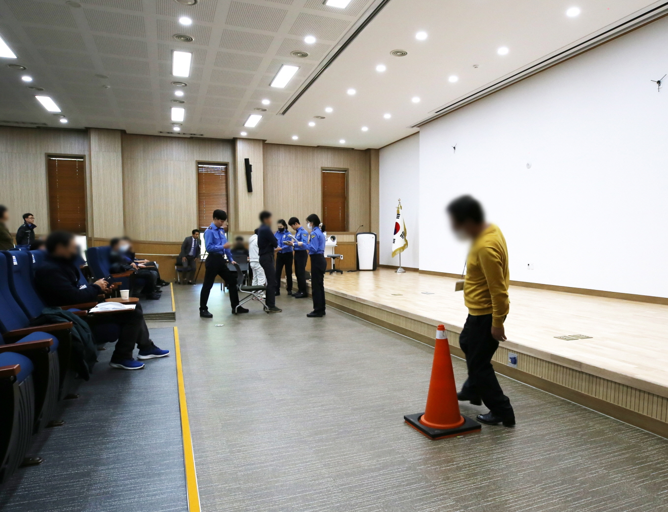 ▲의자에 앉아 3m 표적 돌아오기 순으로 체력검정을 진행하고 체력검사 합격자에 한해 개별 면접이 이뤄졌다.
