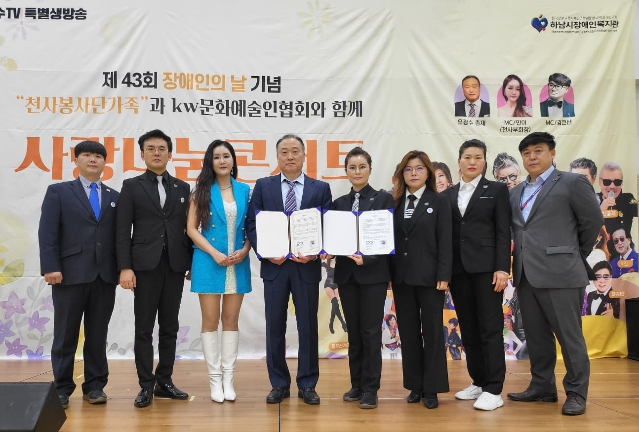 제43회 장애인의 날을 맞아 그 의미를 되새기고 장애인들과 더불어 사는 세상을 만들기위해 (사) 천사 보금자리 봉사단은 (사) KW문화예술인협회 (이사장 이동준)와 연예인 봉사단 회원들이 함께 경기도 하남시 장애인 복지관을 방문하여 위문품으로 기저귀 5톤(1만 장), 생필품 등을 전달하고 장애인과 비장애인이 함께 하는 '사랑나눔 콘서트'를 유투브 광수TV 특별 생방송으로 진행하였으며 생필품 전달식 후 개최된 사랑나눔 콘서트에는 유광수 총재와 민이 부총재의 진행으로 많은 가수들이 장애인의 날 사랑나눔 콘서트에 참여하여 나눔과 봉사로 의미 있는 시간을 보냈다.