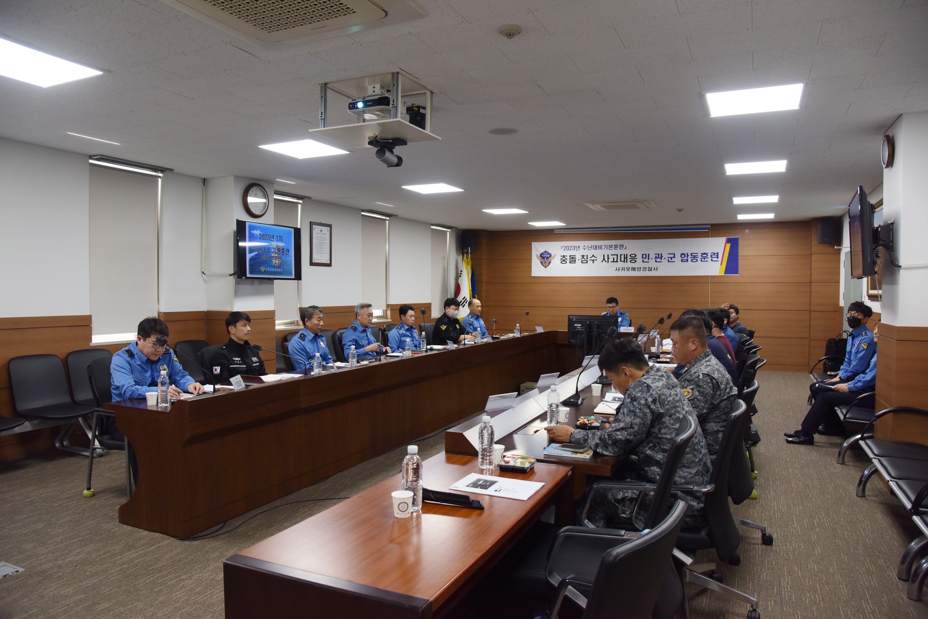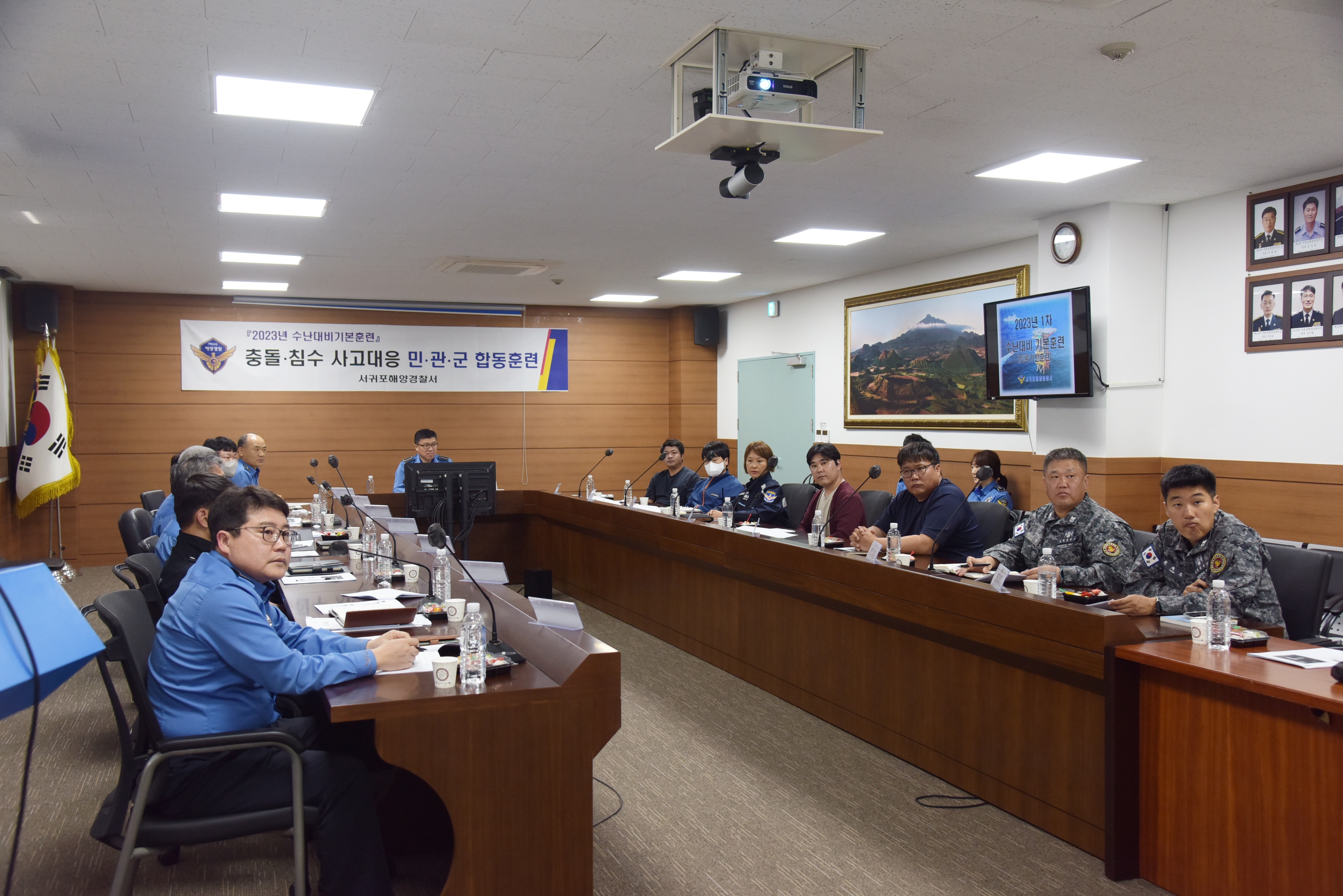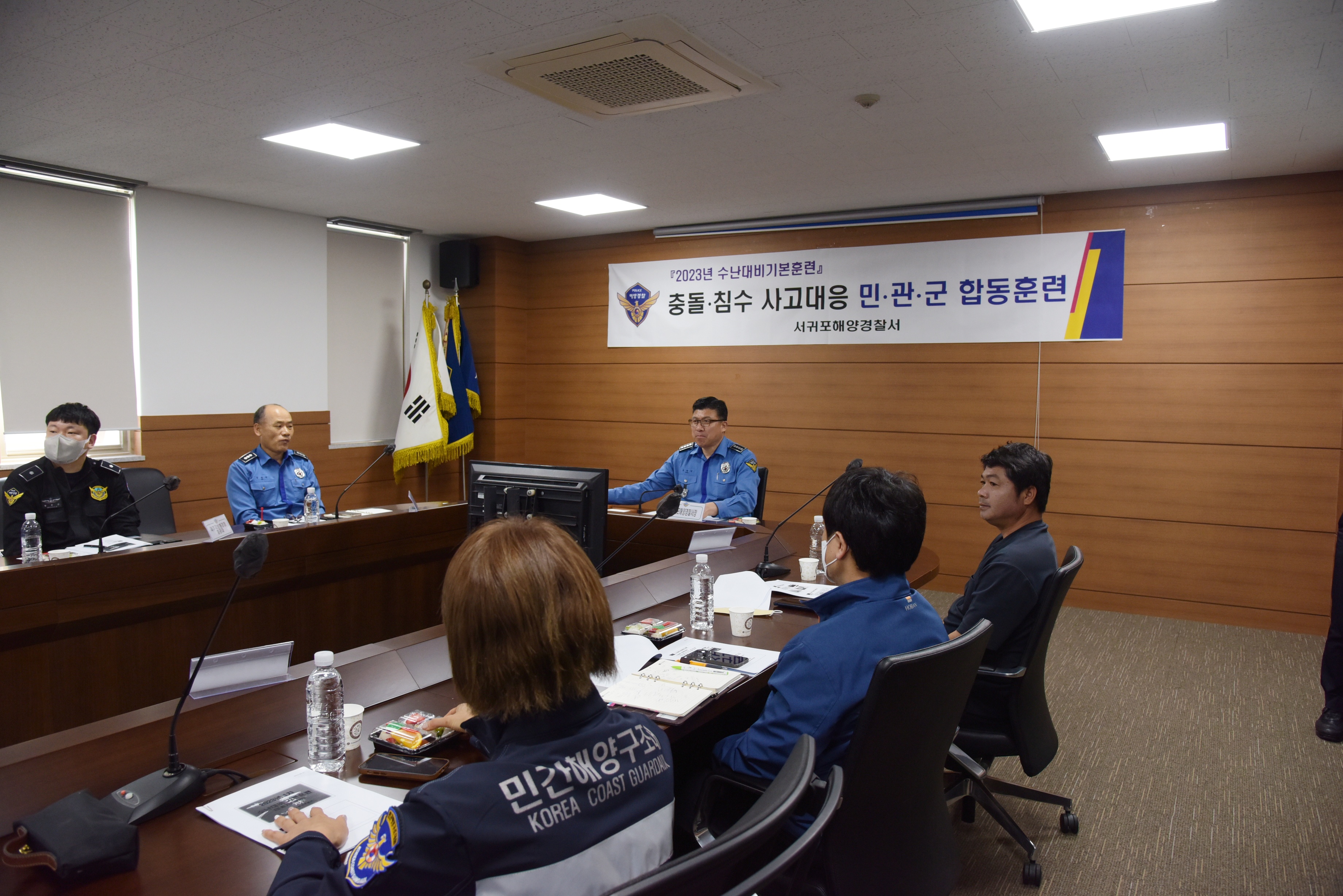 서귀포해경에 따르면, 오늘 오후 2시 청사내 회의실에서 진행된 이번 훈련은 서귀포해양경찰이 주관하고 해군 SSU, 민간해양구조단체 등 3개 해양관련 기관 및 단체 8명과 해양경찰 지역구조본부 및 현장부서 구성인력 29명이 함께 진행하였다.