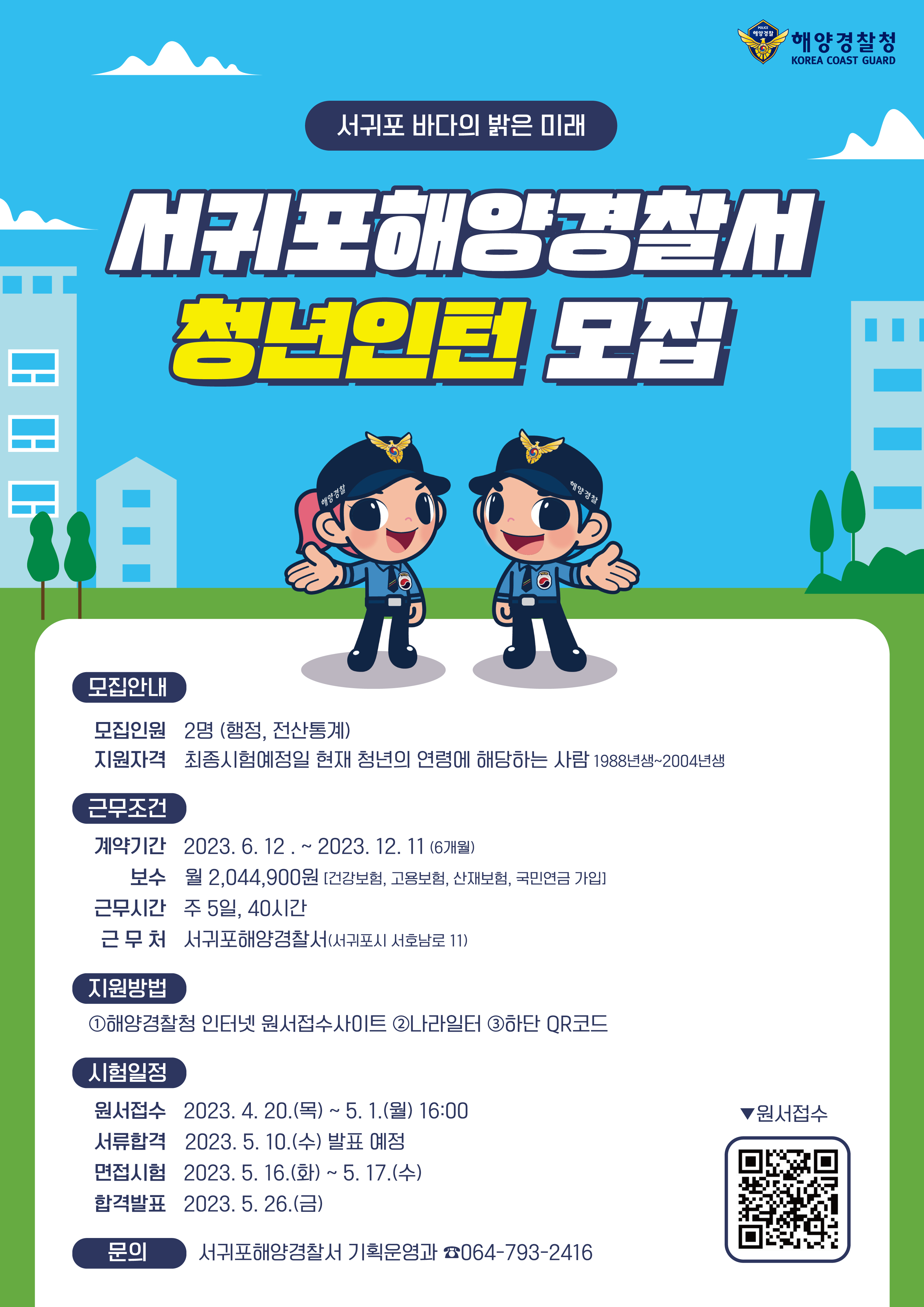 지원서는 5월 1일 16:00까지 해양경찰청 인터넷 원서접수 사이트 또는 나라일터에서 접수하면 된다. 최종합격자는 서류전형과 면접을 거쳐 5월 중 선발 예정이며, 채용 후 6개월간 서귀포해양경찰서에서 근무하게 된다.