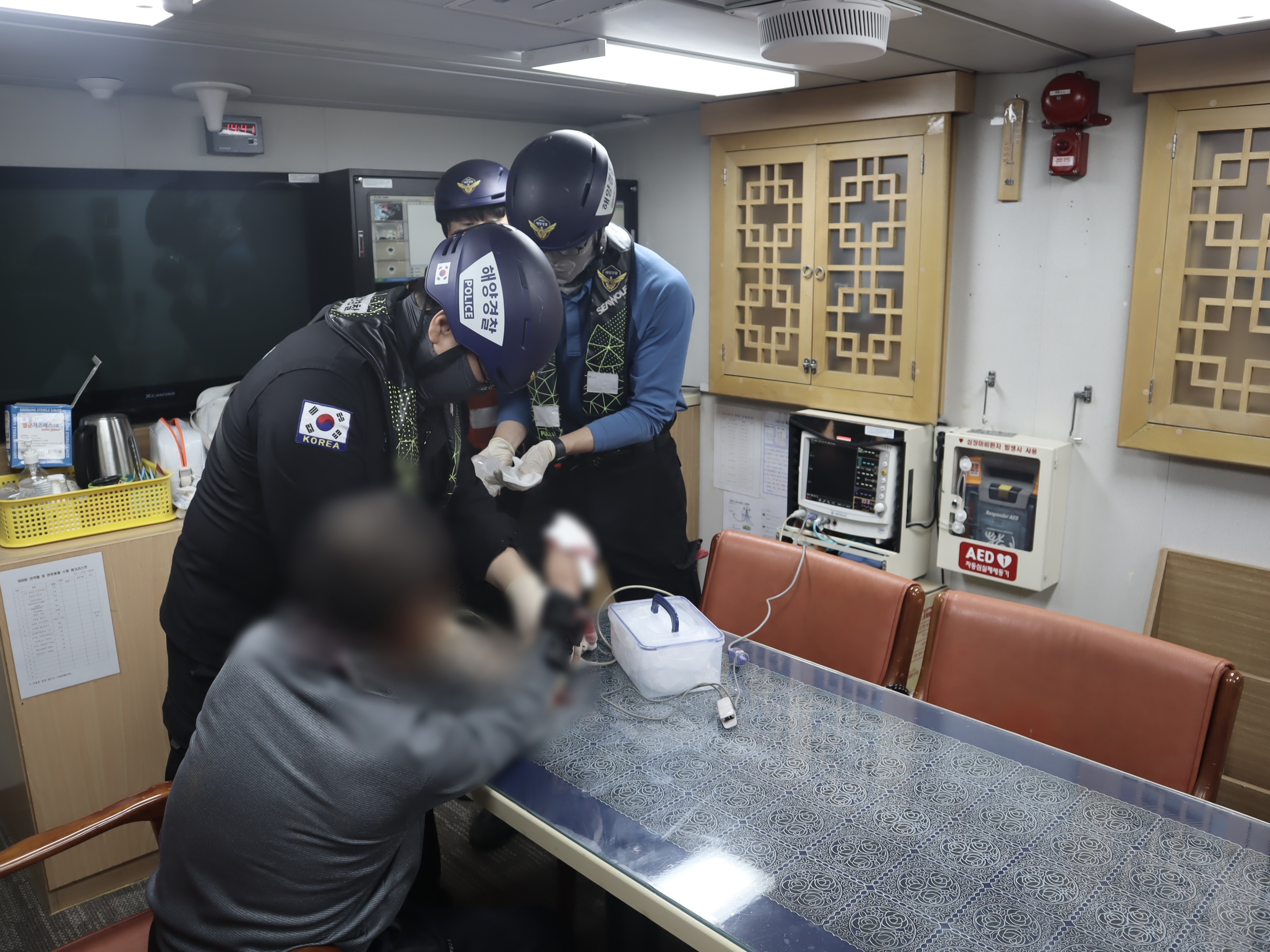 B씨는 손가락 골절과 출혈이 있어 지혈 및 붕대를 이용한 구조대원의 응급처치를 받으며 인근 항으로