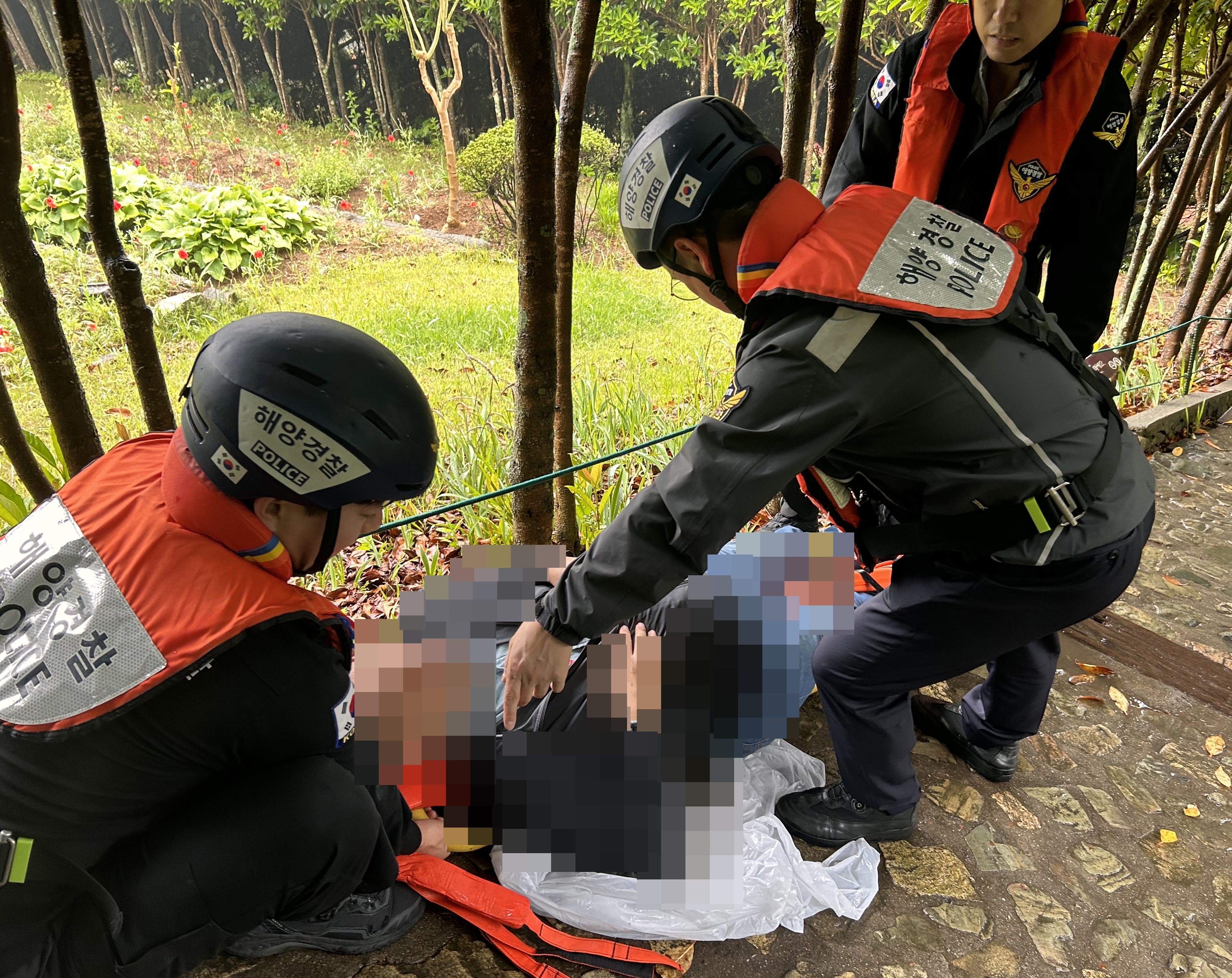 빗물에 미끄러져 우측 정강이 부위(골절 추정)에 부상을 입었으며, 통영해경은 부목으로 응급처치를 한 후
