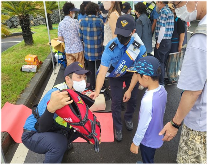 주요내용으로는 ▲ 홍보물 배부 및 구명조끼 착용 체험, ▲ 심폐소생술 교육, ▲ 물놀이 안전수칙 퀴즈 등이며, ▲ 어린이들을 대상으로 해양경찰 영상시청과 해양경찰제복 입기체험 등 해양경찰 직업체험의 기회도 제공했다.