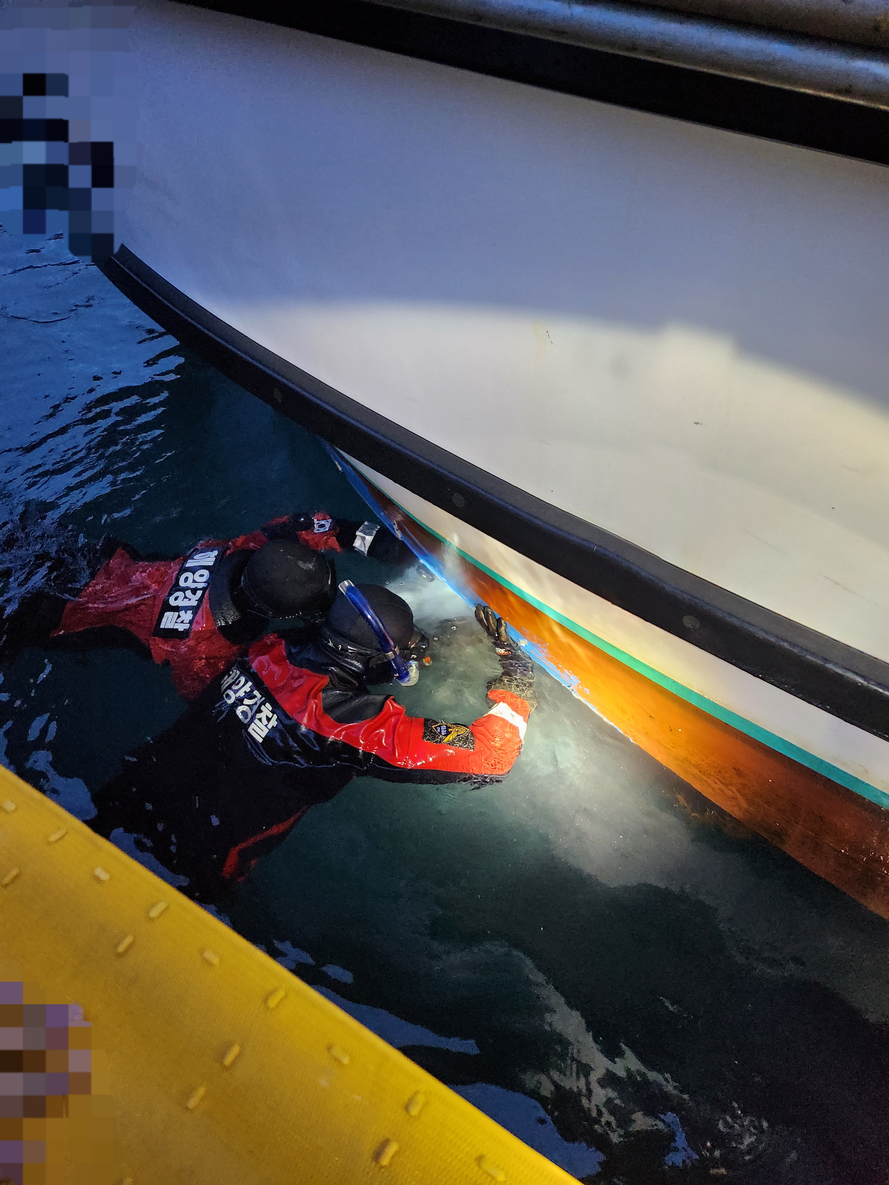 현장에 도착한 통영해경은 안면타박상을 입은 승선원 1명(76년생, 여)을 거제시 대포항으로 신속하게 이송하여 대기중인 119 구급대에 인계하였고 수중에 구조대를 투입하여 선수 좌현 1.5m 균열을 확인 후 파손부위를 신속히 봉쇄하고 배수펌프·잠수펌프를 동원해 배수작업을 실시, 사고선박을 통영 삼덕조선소로 안전하게 입항 조치하였다.