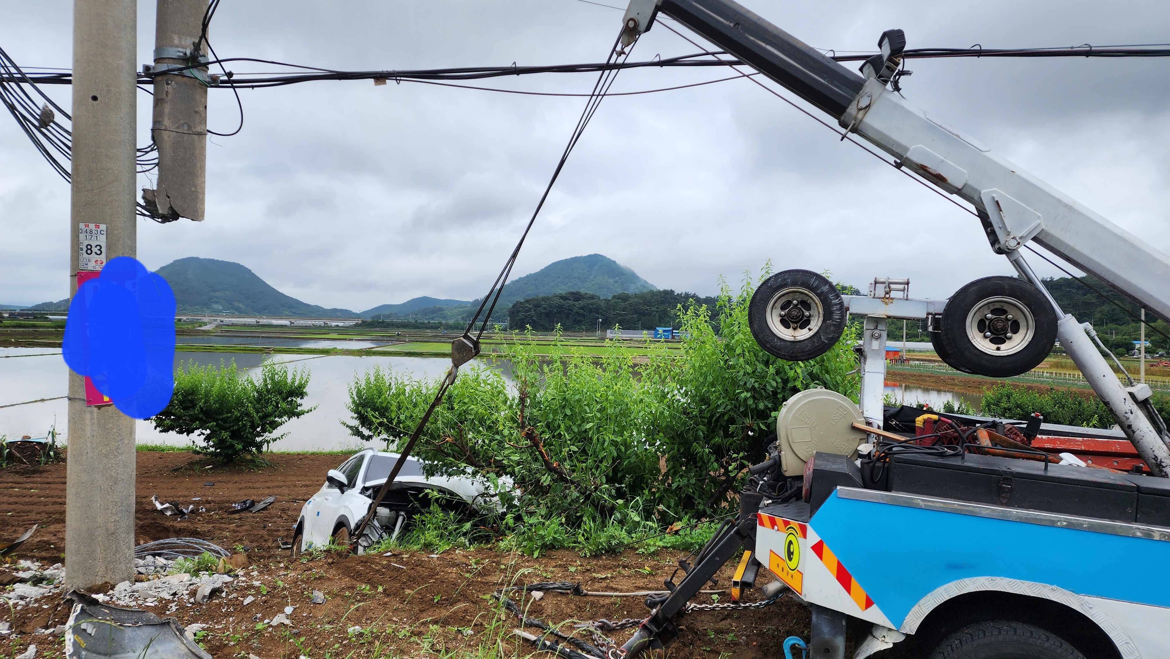이 사고로 전신주가 두동강나고 차량은 반파 되었으며 운전자(60대여성)는중상으로 119에의해 구조되어 병원으로 후송되었다.