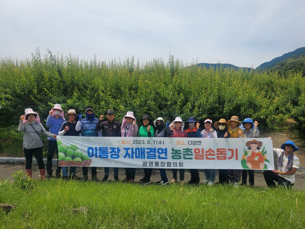 이를 지원하기위해 지속적인 교류(자매결연)를 하고있는 광영동 통장협의회에서는 매실수확철 부족한 일손을 돕기위해 다압면 이장단의 농가에 매실수확을 지원했다.