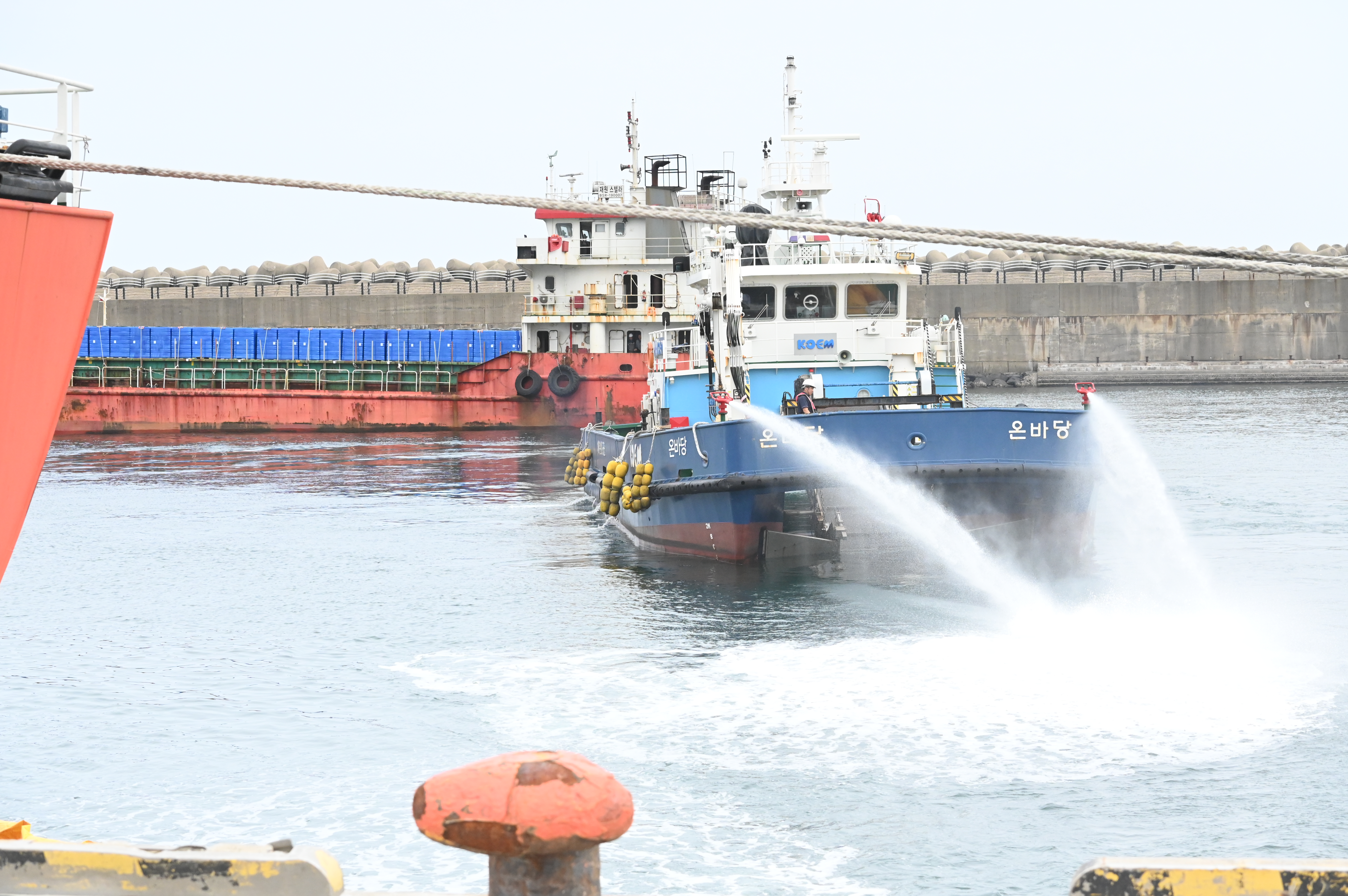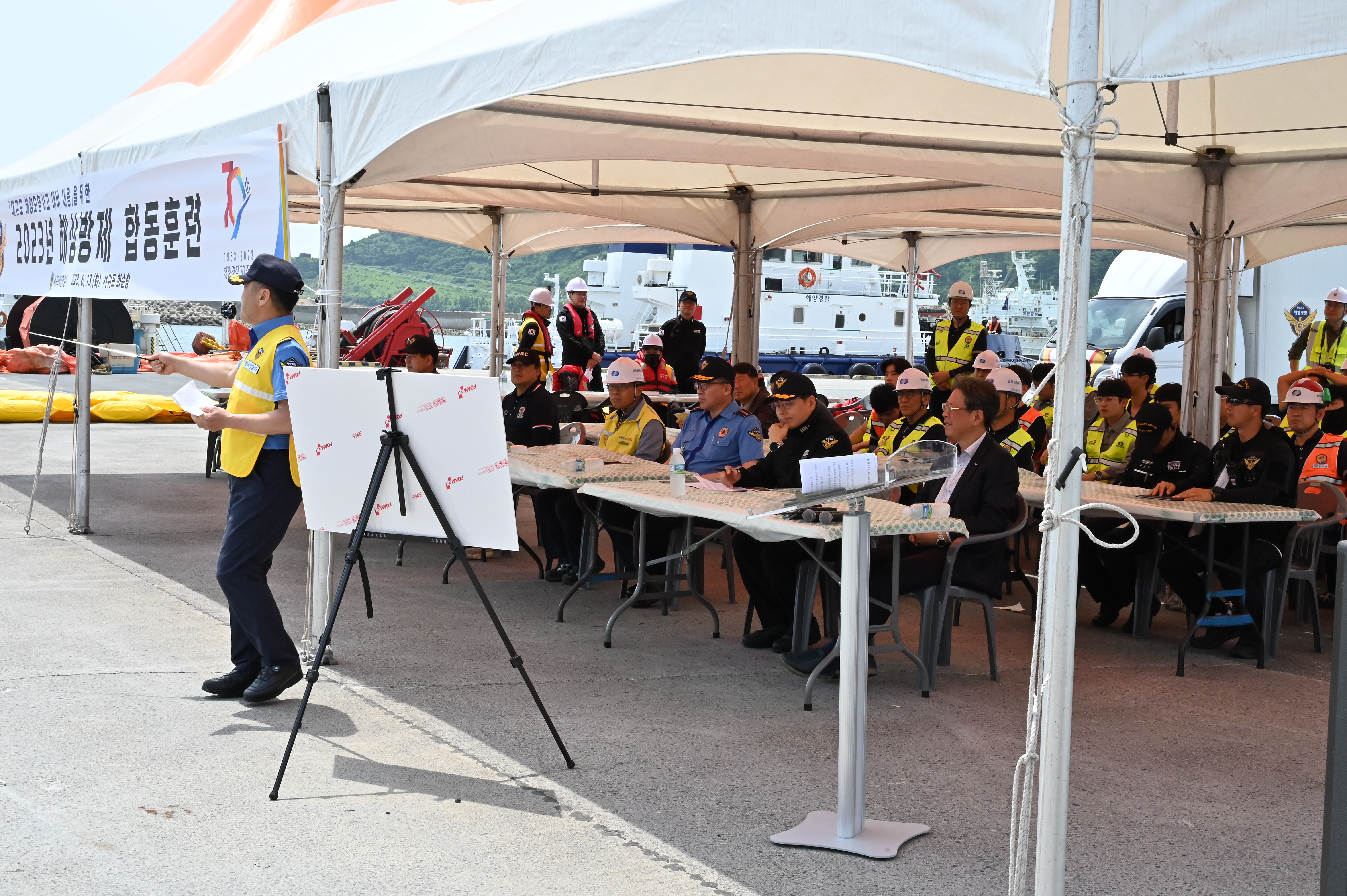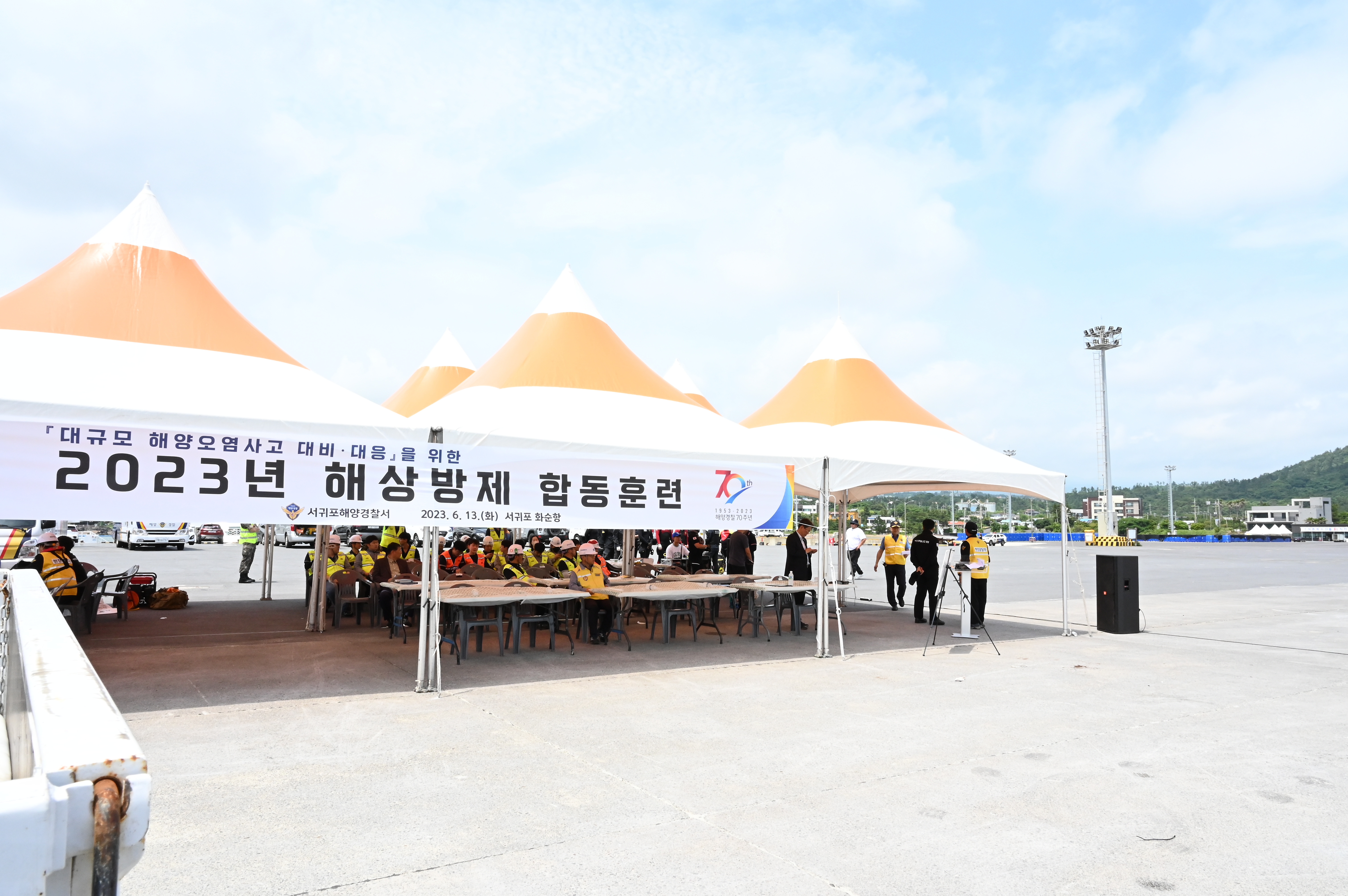 서귀포해양경찰(서장 윤태연)는 어제(13일) 오후 2시쯤 화순항 내 유조선 부두 앞 해상에서 유조선 기름 유출 사고를 가정한 “2023년 해상방제 합동훈련”을 실시했다.
