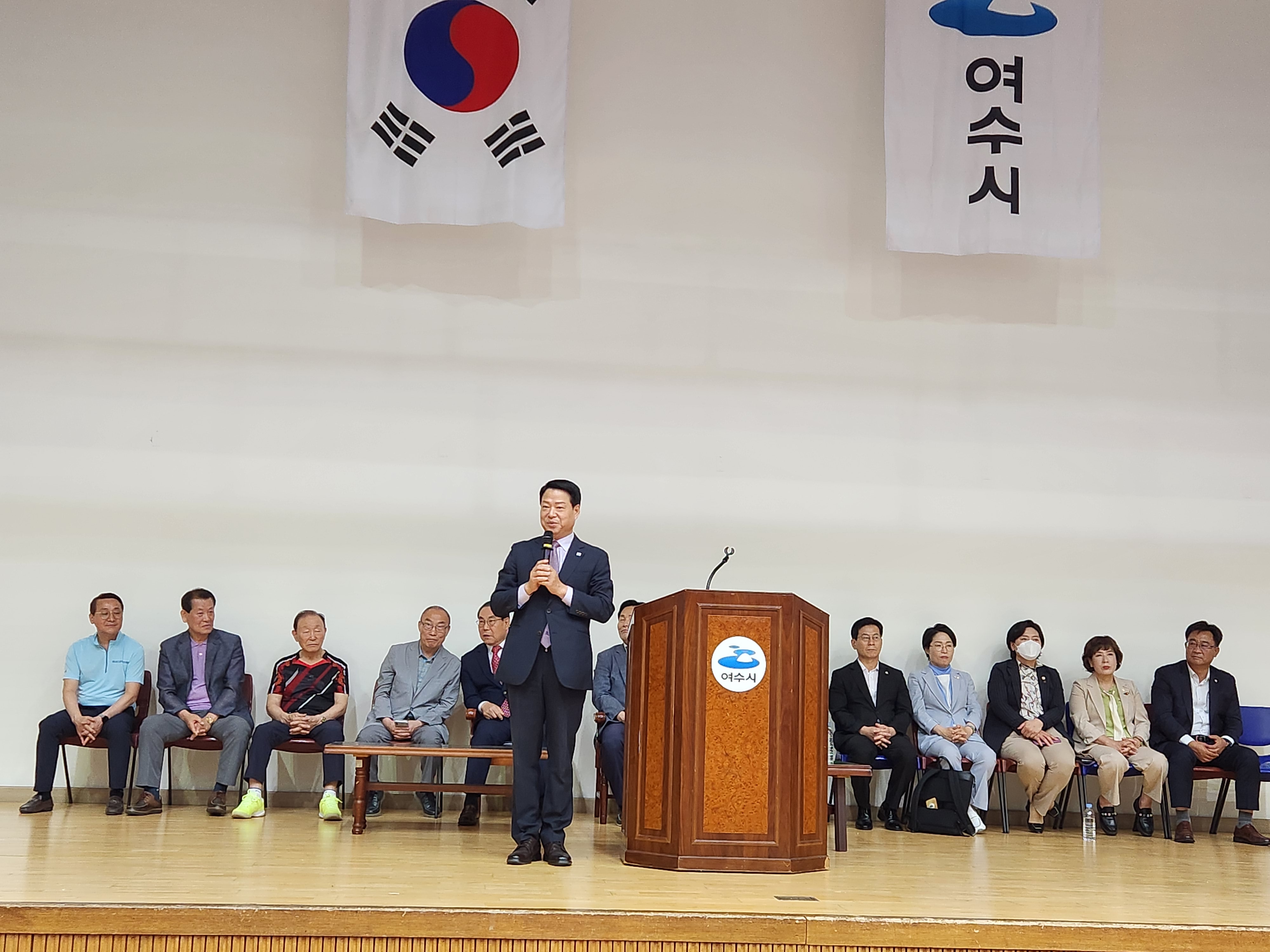 여수시 돌산체육관에서 개최된 “시니어 라지볼 탁구대회”에서 박성현 여수광양항만공사 사장(사진 가운데)이 축사를 하고 있다.