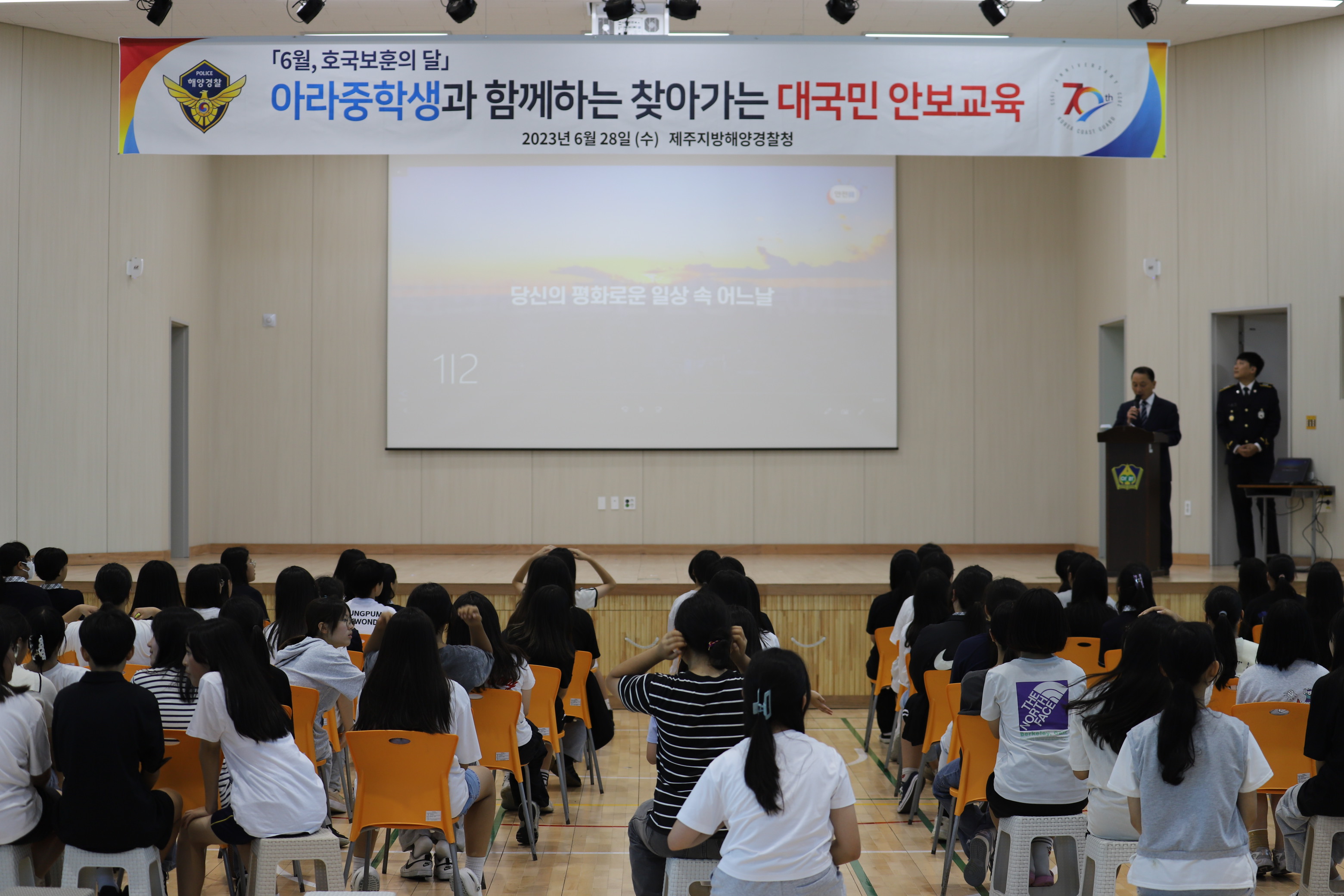 제주지방해양경찰청에 따르면, 오늘(28일) 13시부터 일상생활 속에서 국민들에게 가까이 다가가 안보의 중요성을 알리기 위해 자라나는 제주 청소년 아라중학교 학생 약 120여 명을 대상으로 안보 교육 프로그램을 마련하였으며,