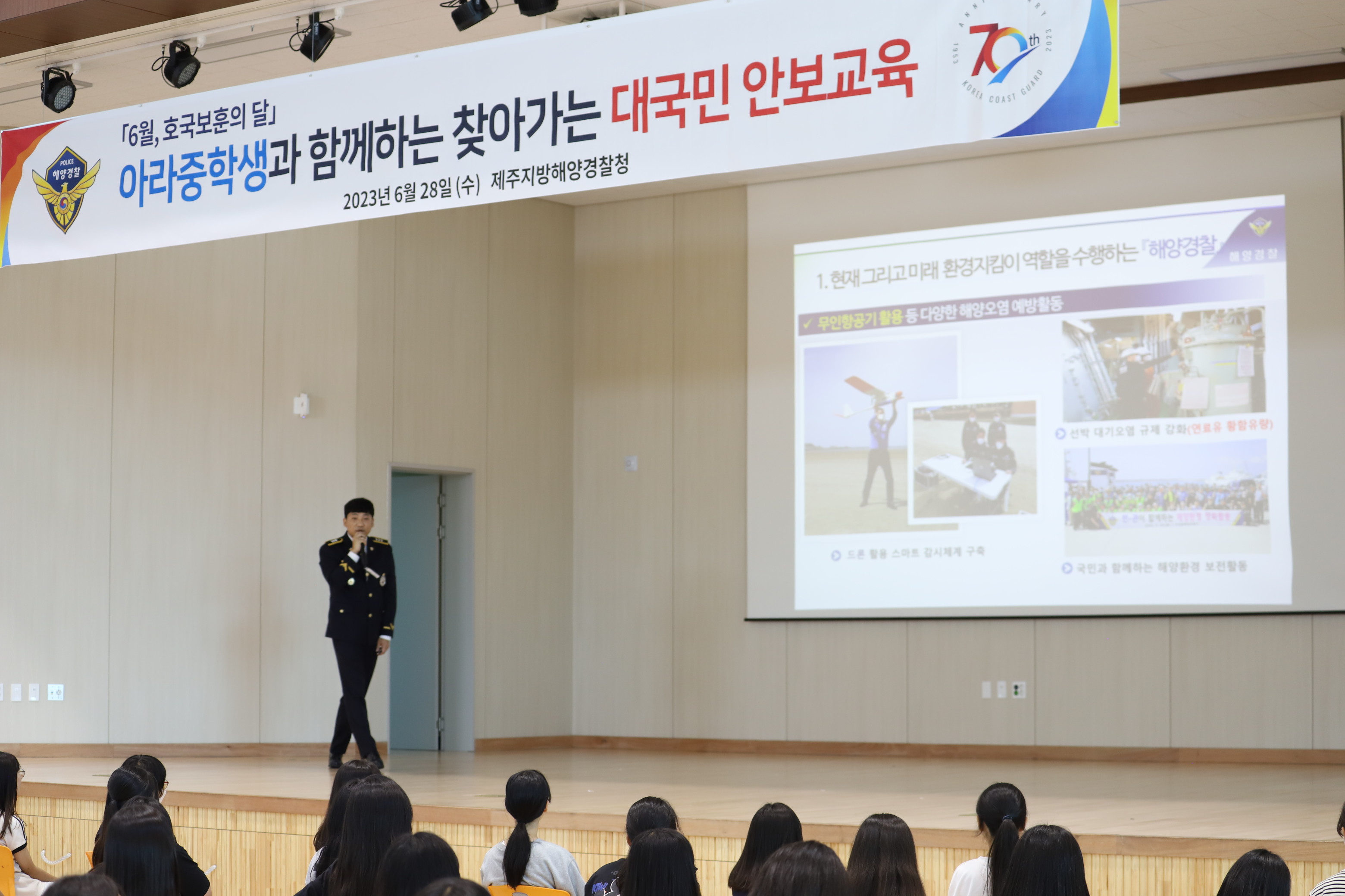 제주지방해양경찰청(청장 한상철)에서는 6월 호국보훈의 달을 맞아 제주시 아라동 소재 아라중학교를 방문하여 제주도민과 함께하는「찾아가는 대국민 안보교육」을 진행했다고 밝혔다.