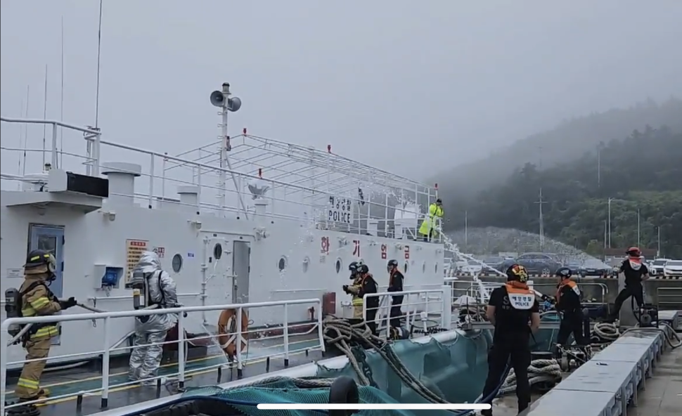 지난 28일 완도해경 전용부두에 위치한 유류 대량 적재 시설물(바지37호)의 화재 대응 역량 강화를 위한