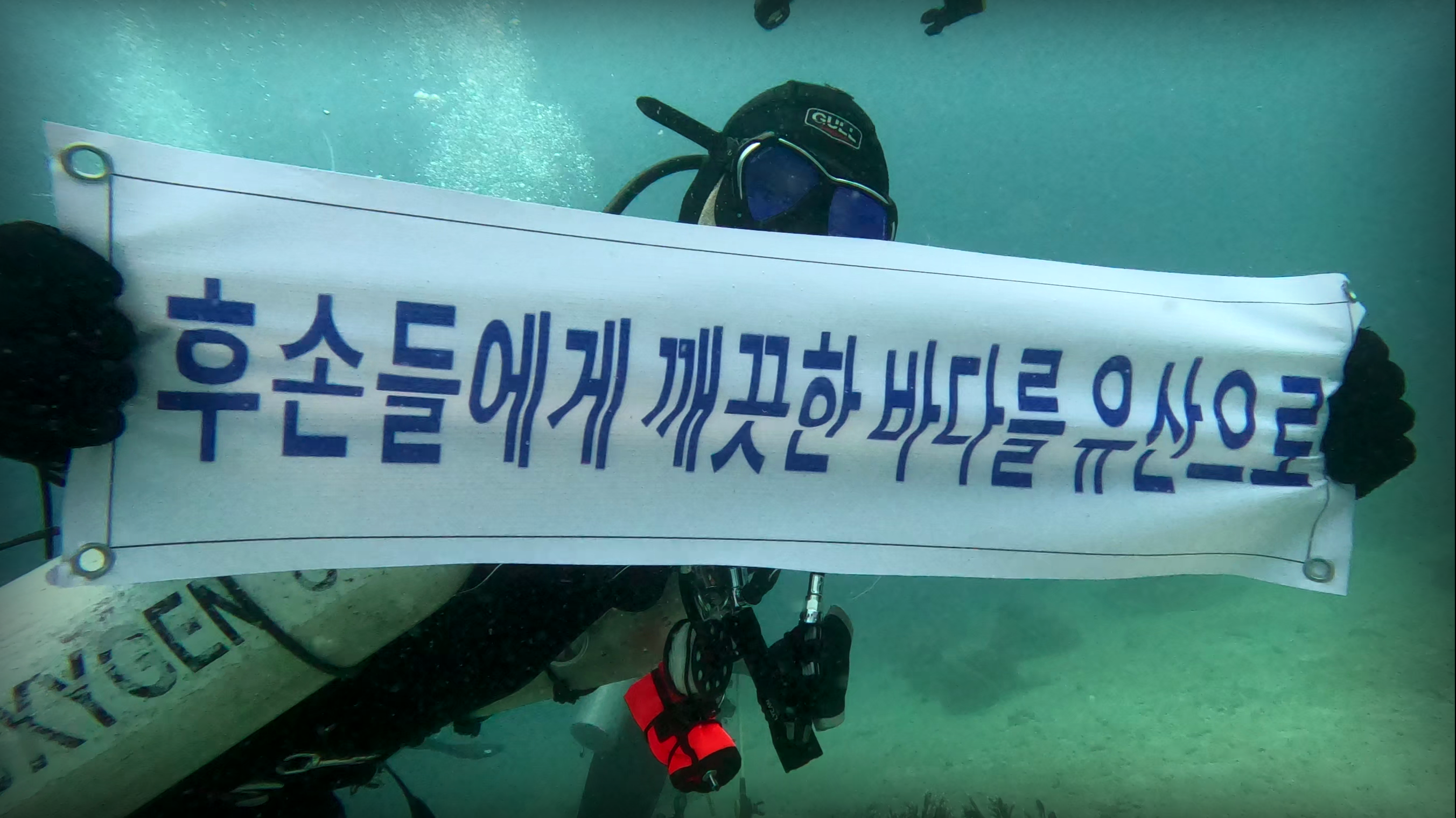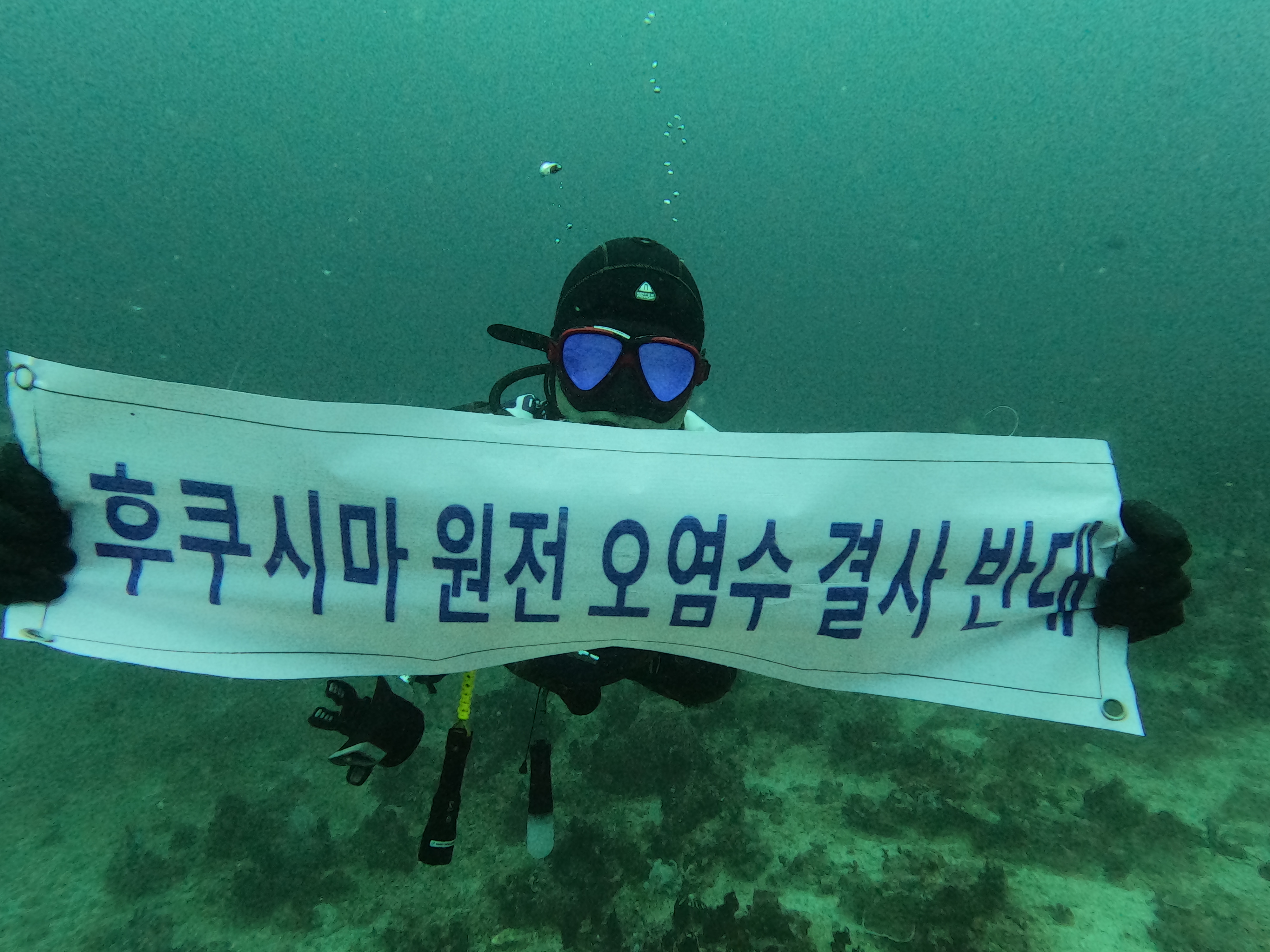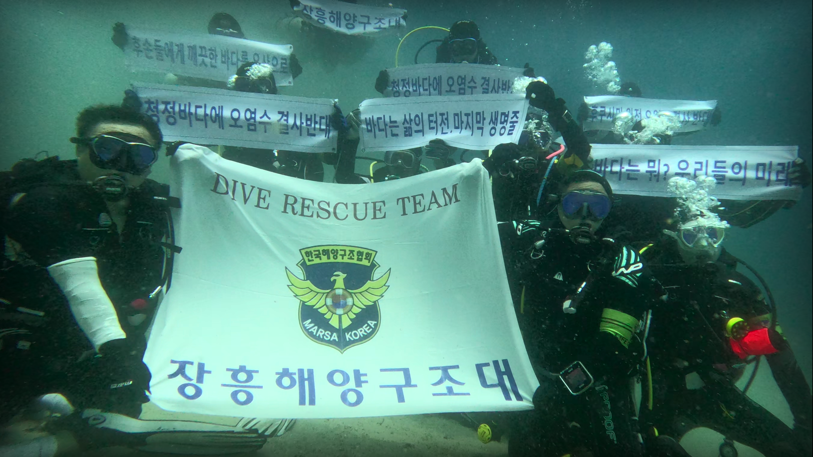 이에 대원들은 수중에서 소리없는 오염수 방출 결사 반대를 외치고 있다,