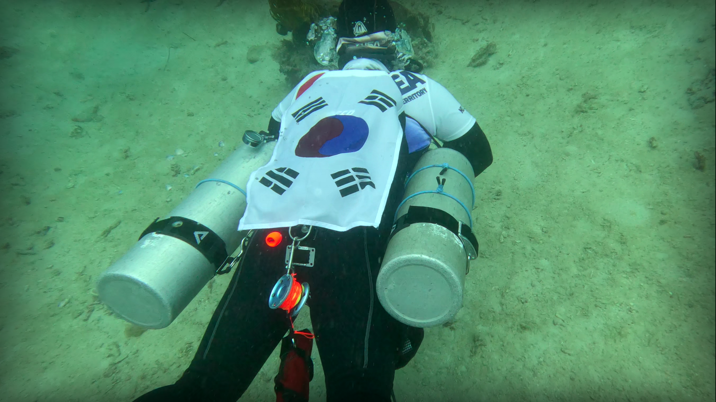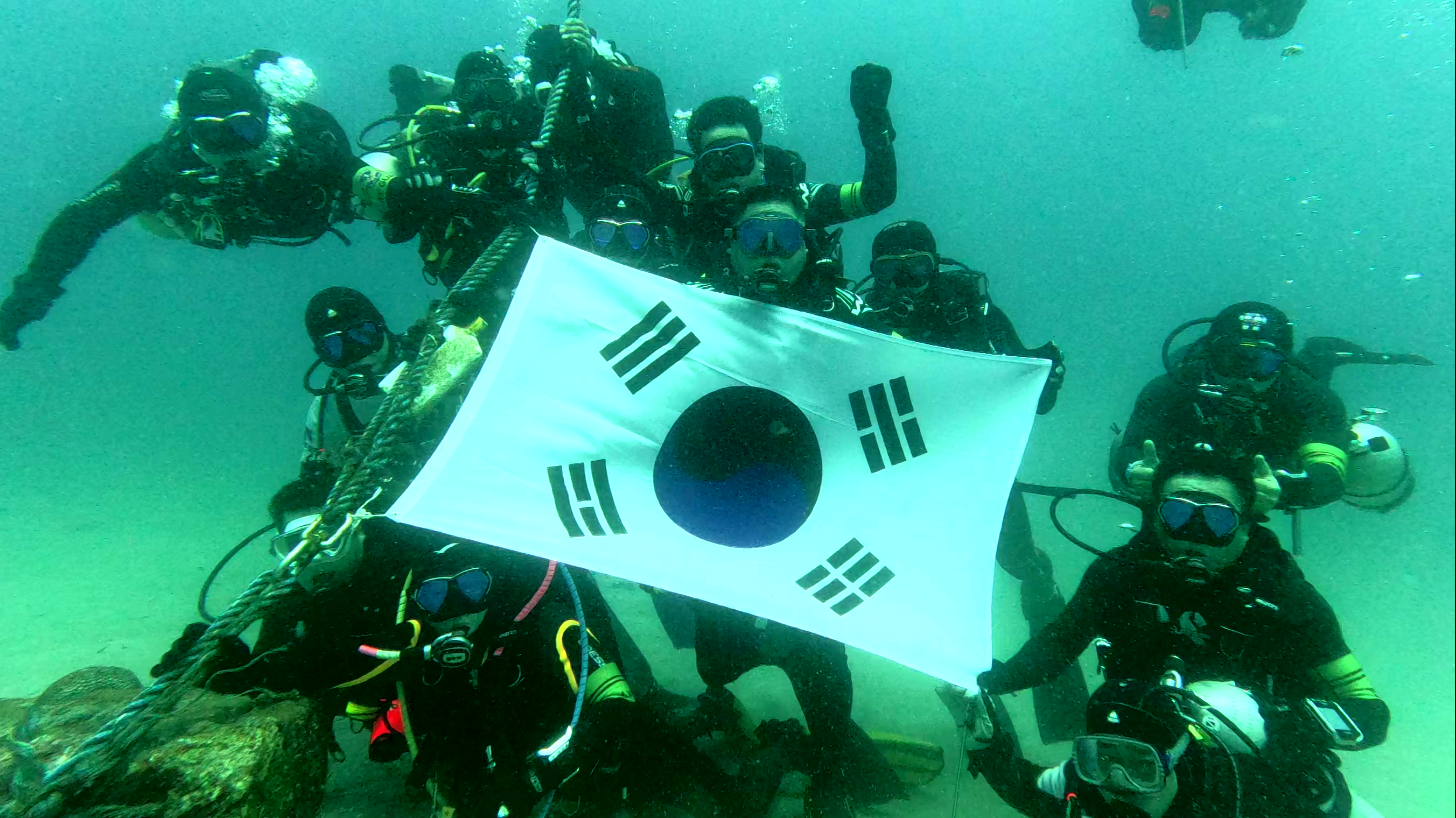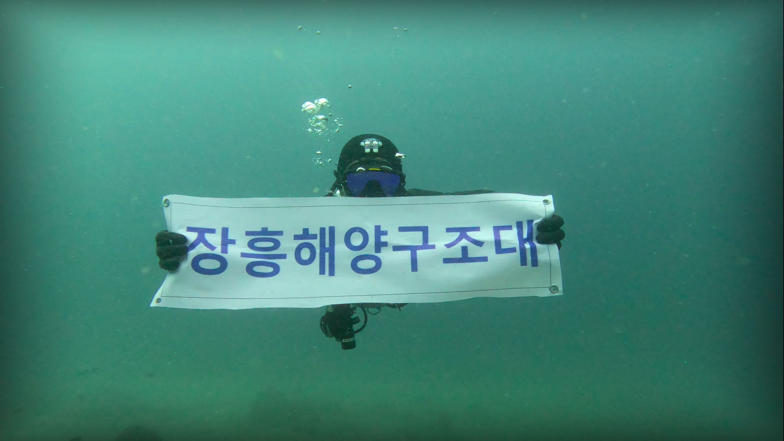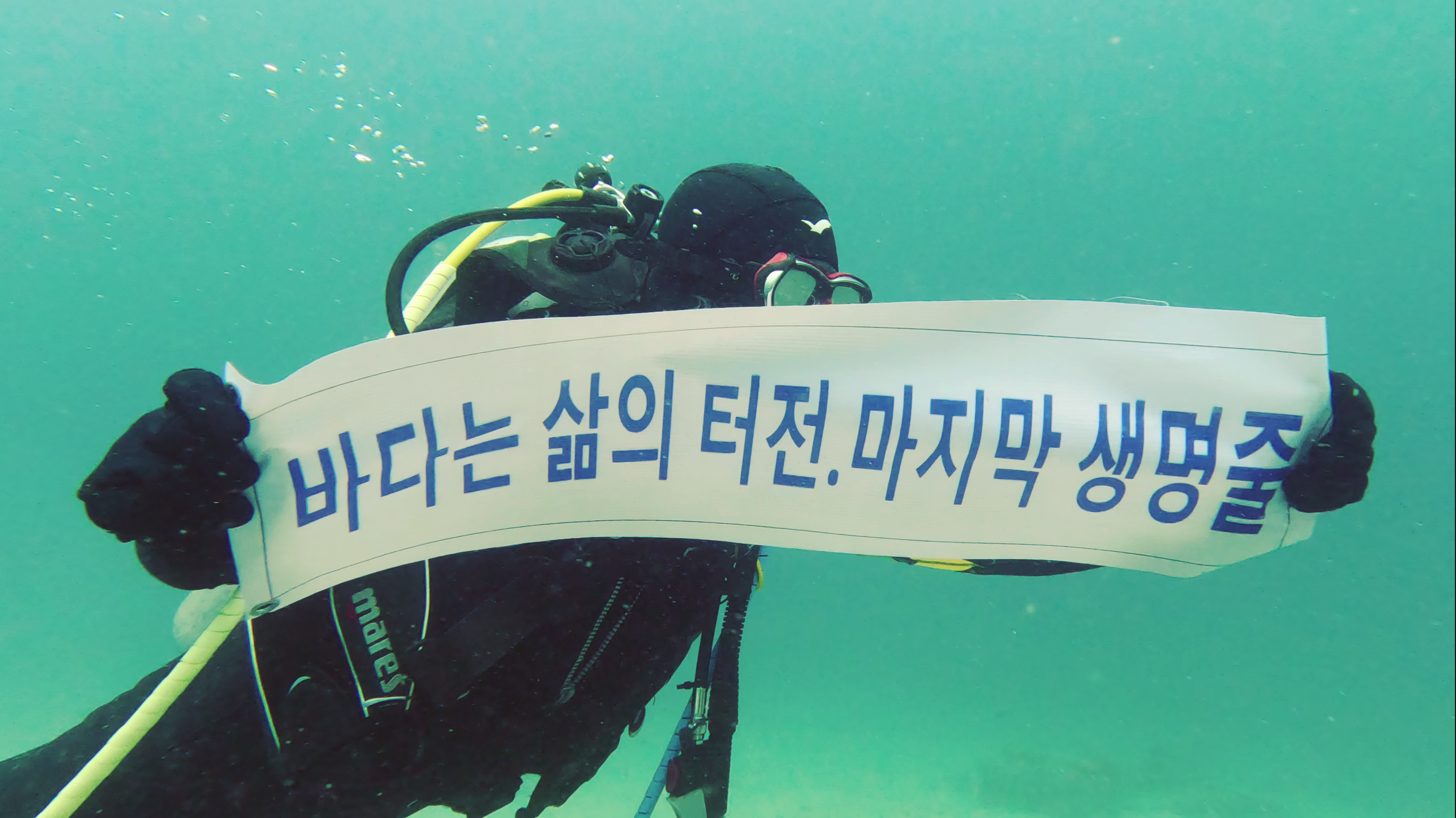 이에 대원들은 수중에서 소리없는 오염수 방출 결사 반대를 외치고 있다,