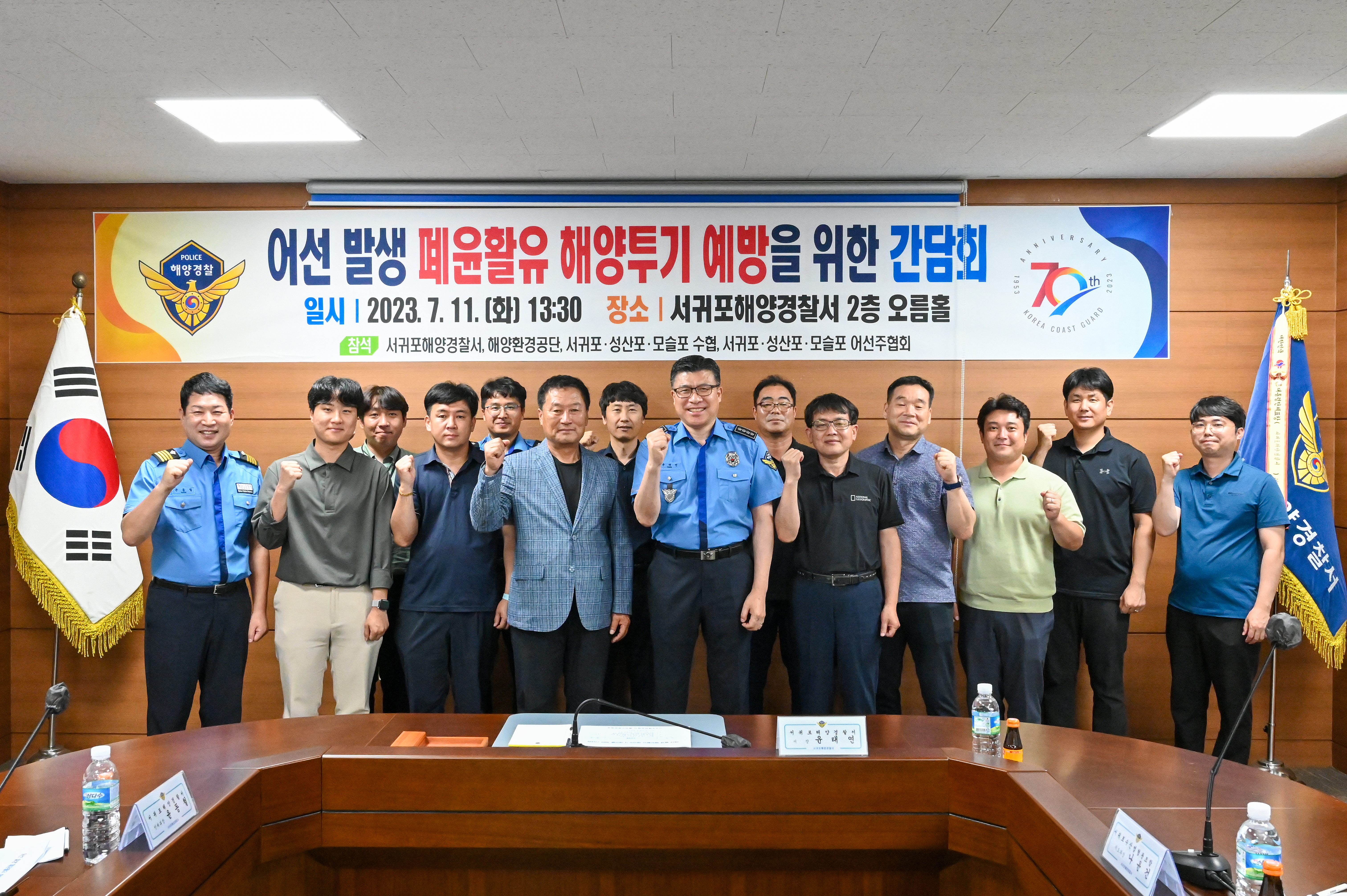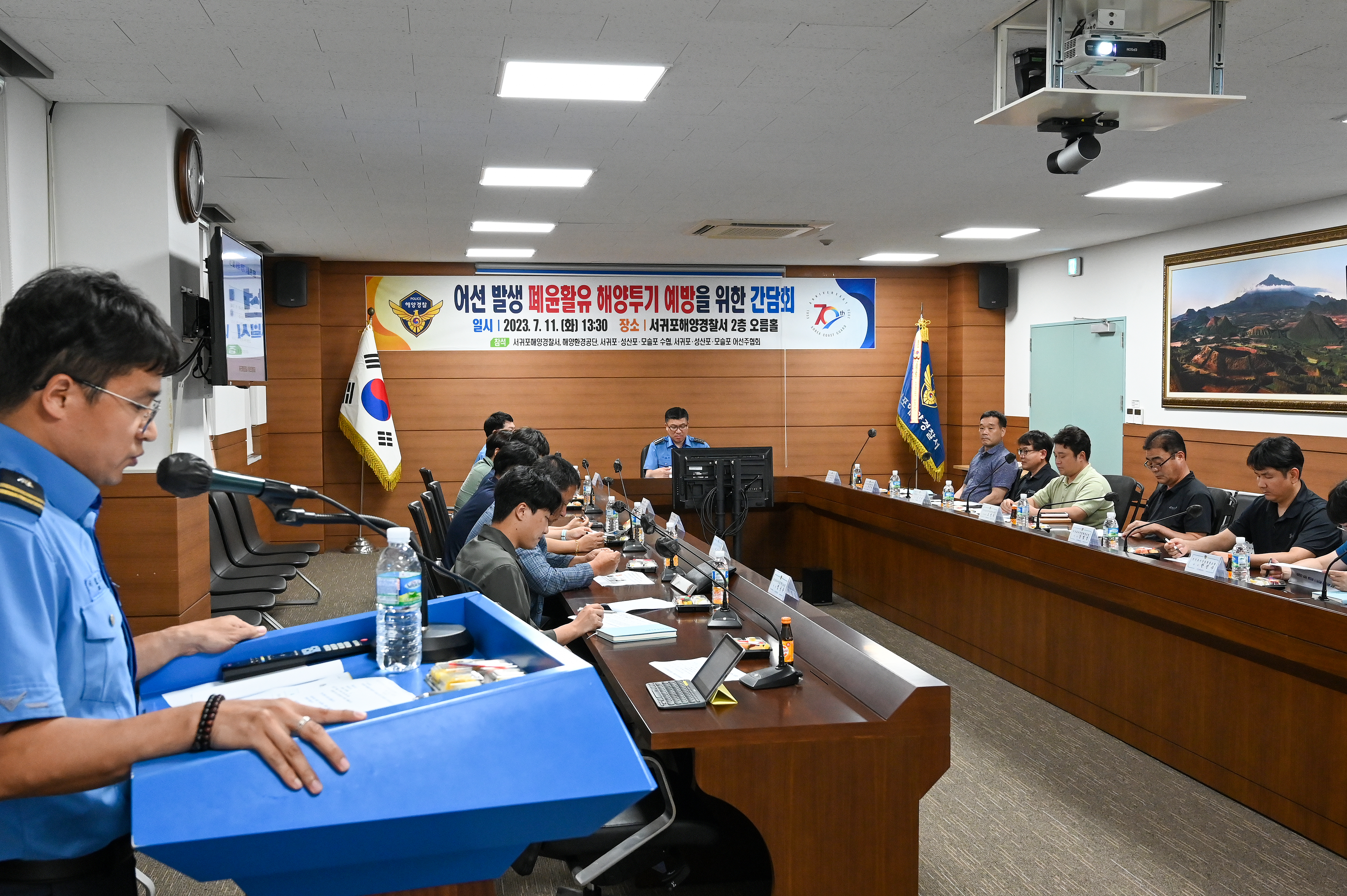 서귀포해양경찰서(서장 윤태연)는 오늘(11일) 서귀포해양경찰서에서 수협, 해양환경공단, 어선주협회 등 관계기관과 모여 서귀포 관내 어선 폐윤활유 해양투기 예방을 위한 간담회를 실시하였다.