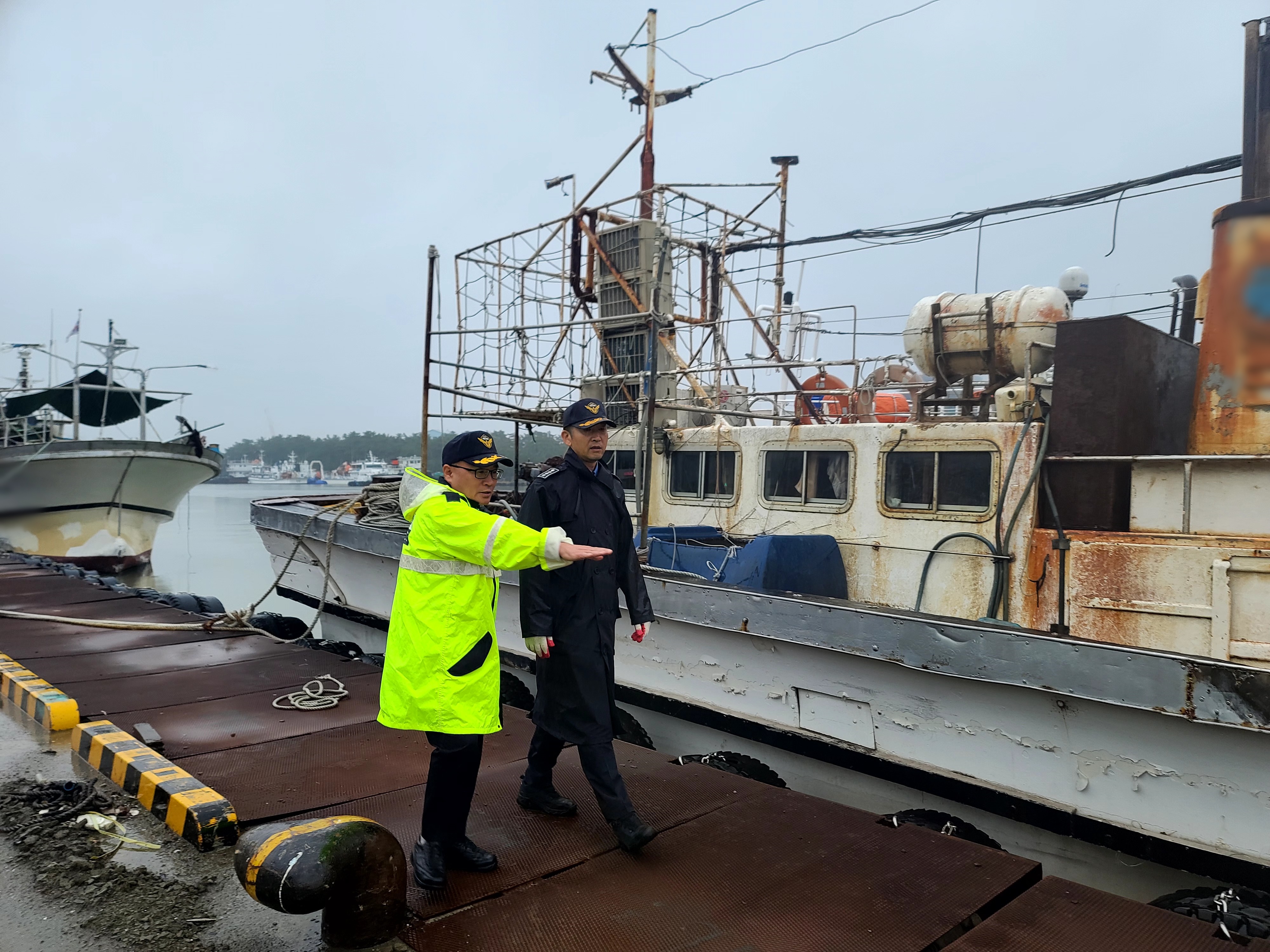 현장을 확인하여 정박중인 어선의 계류줄 보강상태와 안전시설을 집중 점검하였다.
