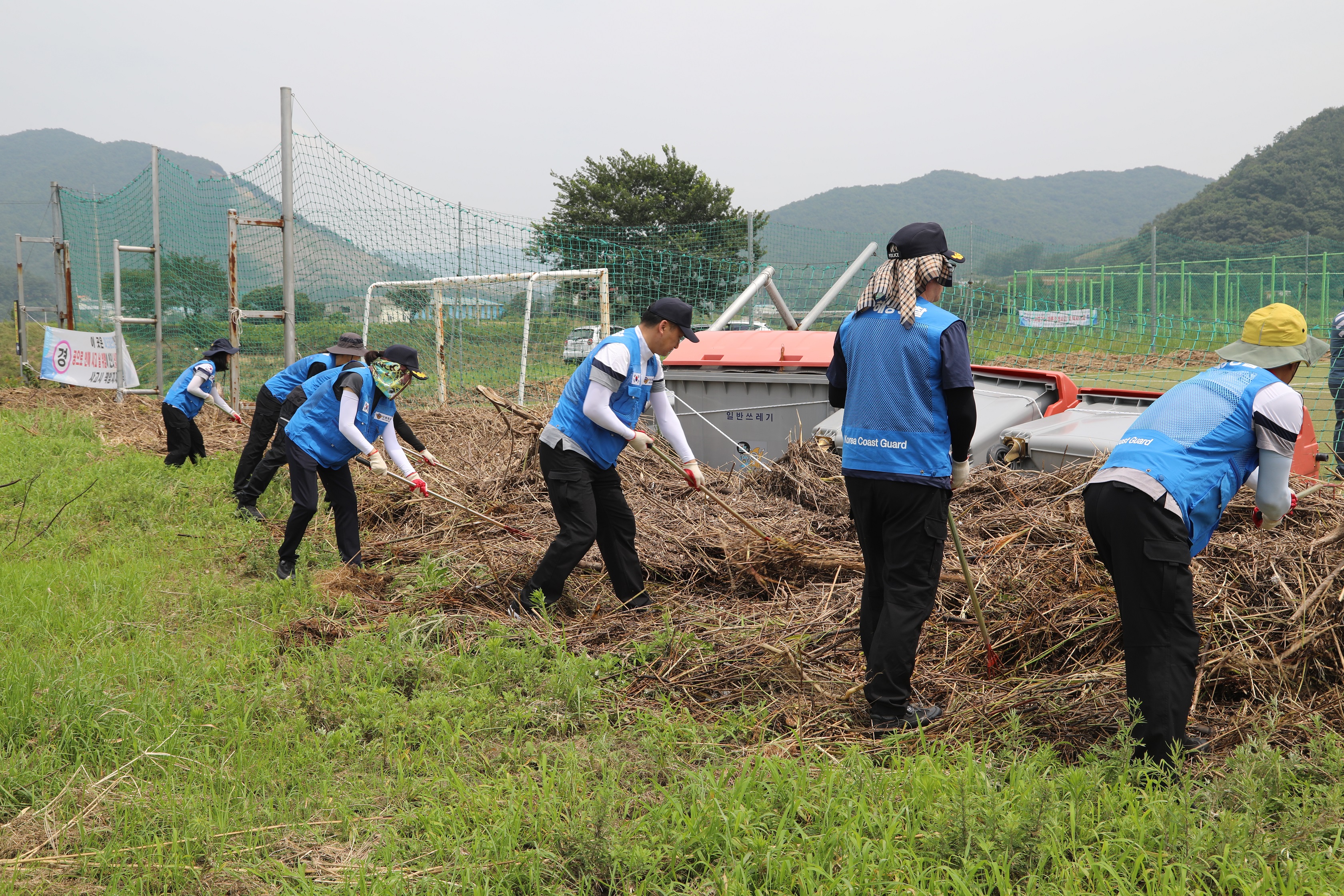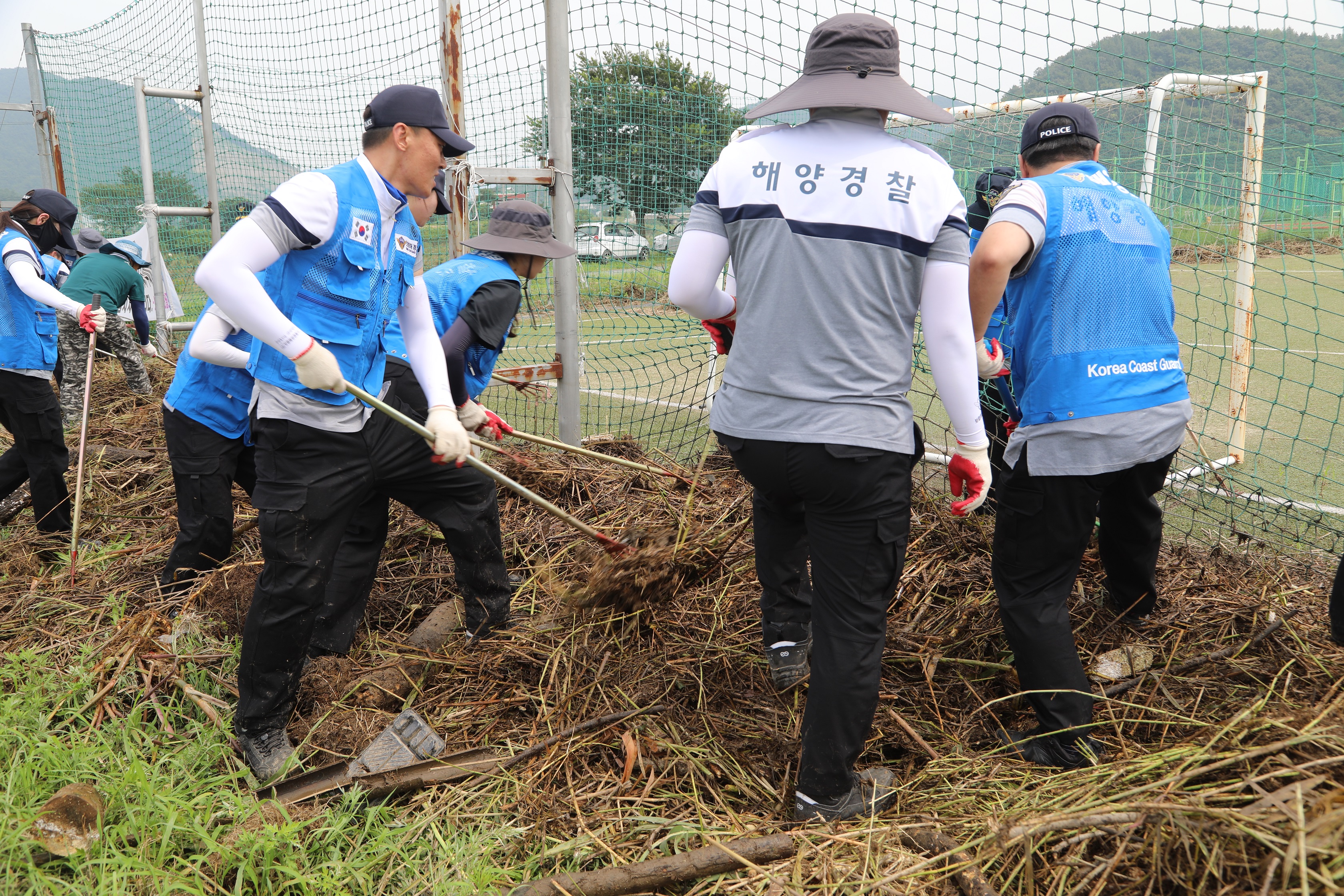 보령해양경찰서는 오늘(20일) 13:30경 웅천천 범람으로 피해를 입은 보령시 웅천읍 노천리 체육공원 일대에서 서장 등 직원 30명이 복구 작업에 나섰다고 밝혔다.