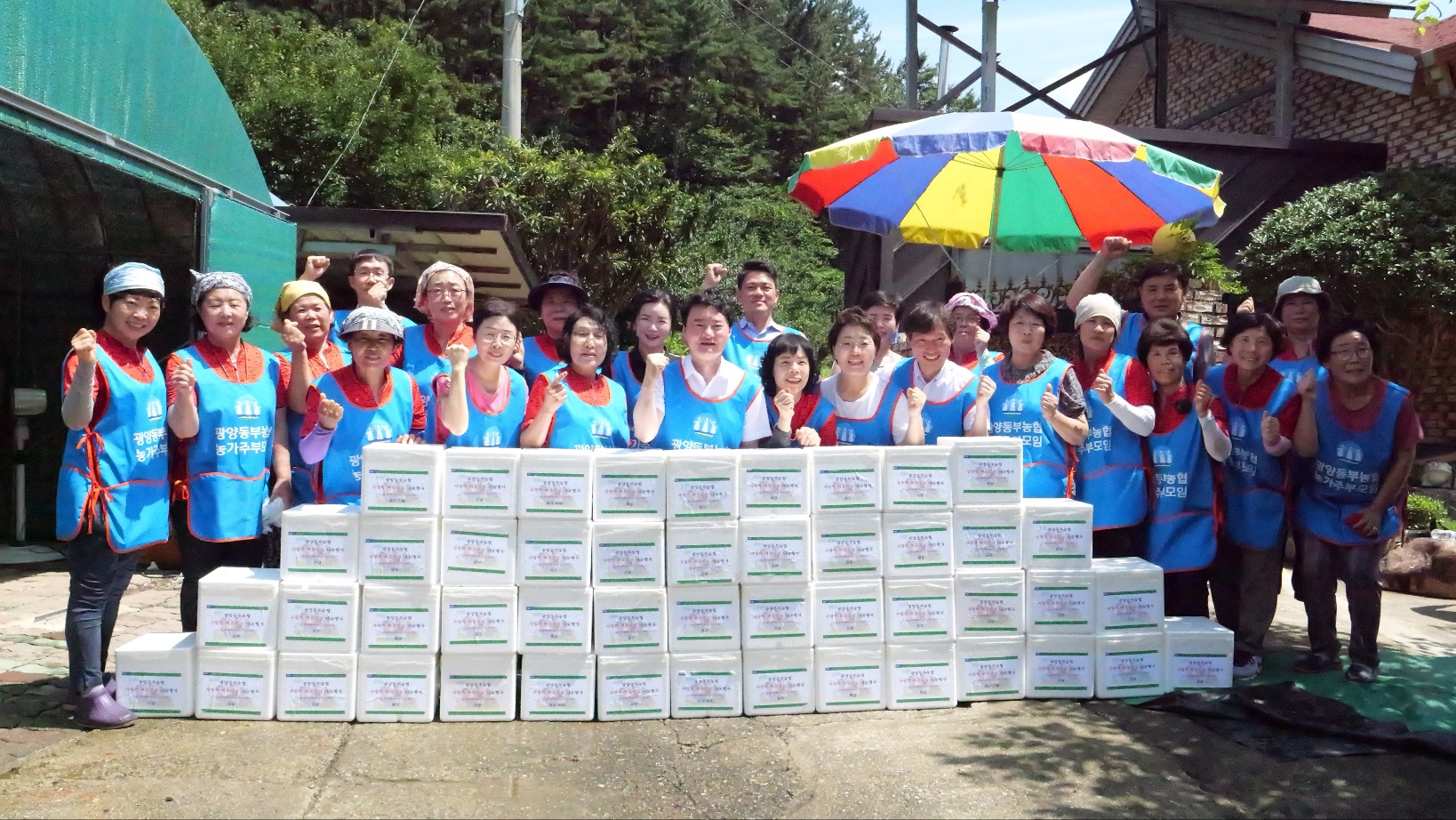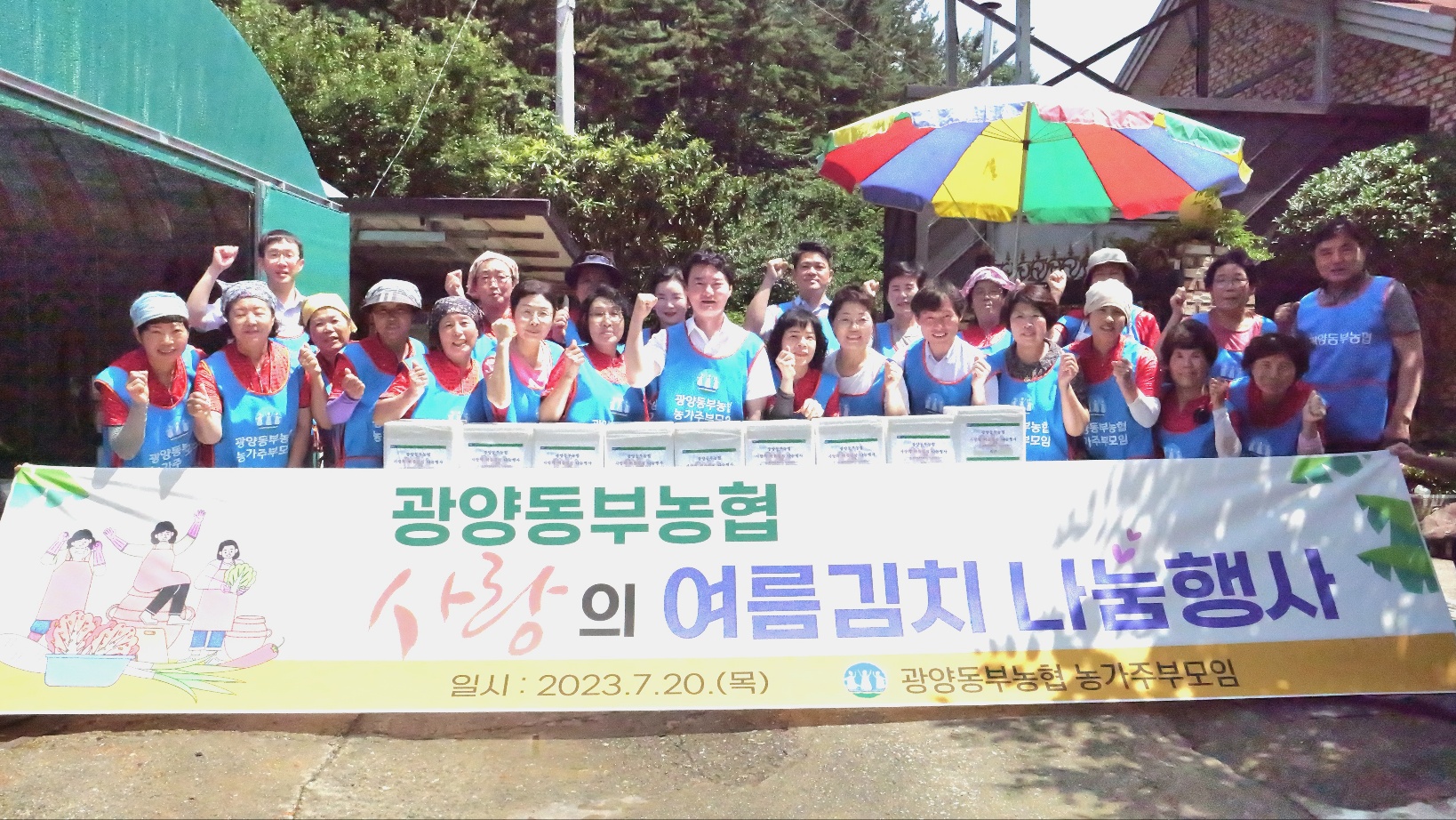 7월 19일부터 20일까지 이틀 동안 광양동부농협 임직원과 농가주부모임 회원 20여 명과 국금옥 (광양시장 사모) 권향엽 (전) 청와대균형인사비서관) 유숙자 (서영배 광양시의원 사모) 김영자 (진상농협 농가주부회장)등이 참석했으며 직접 담근 김치 300포기를 광양동부농협 관내 마을회관에 전달하였다.