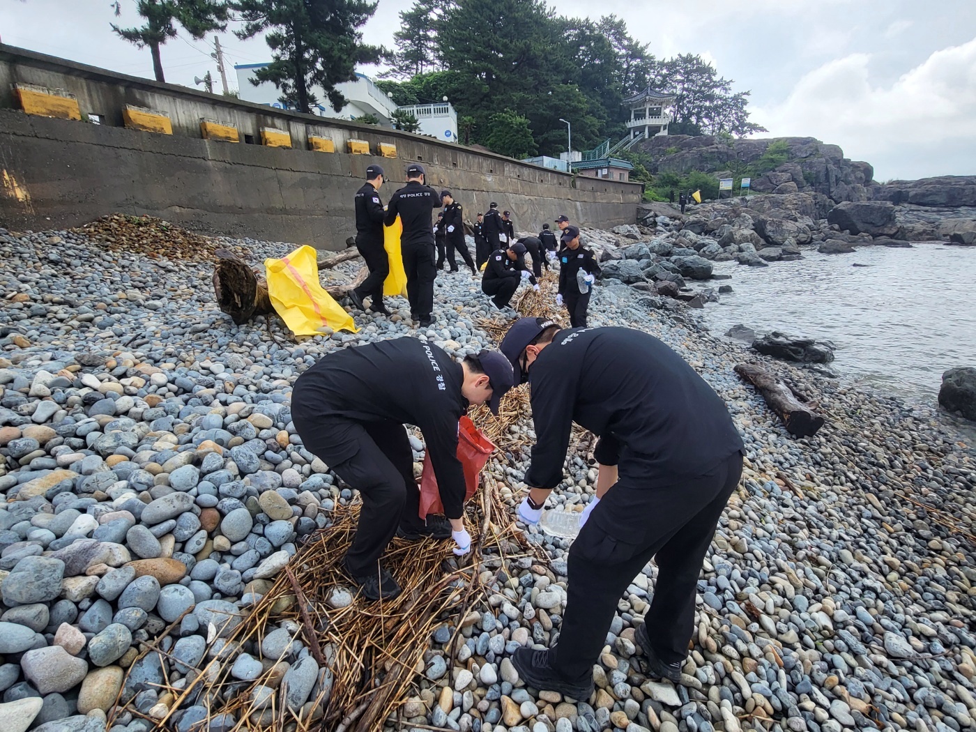 해양경찰교육원(원장 여성수)은 21일 최근 집중호우로 유입된 인근지역 해안가 쓰레기와 부유물 수거 등