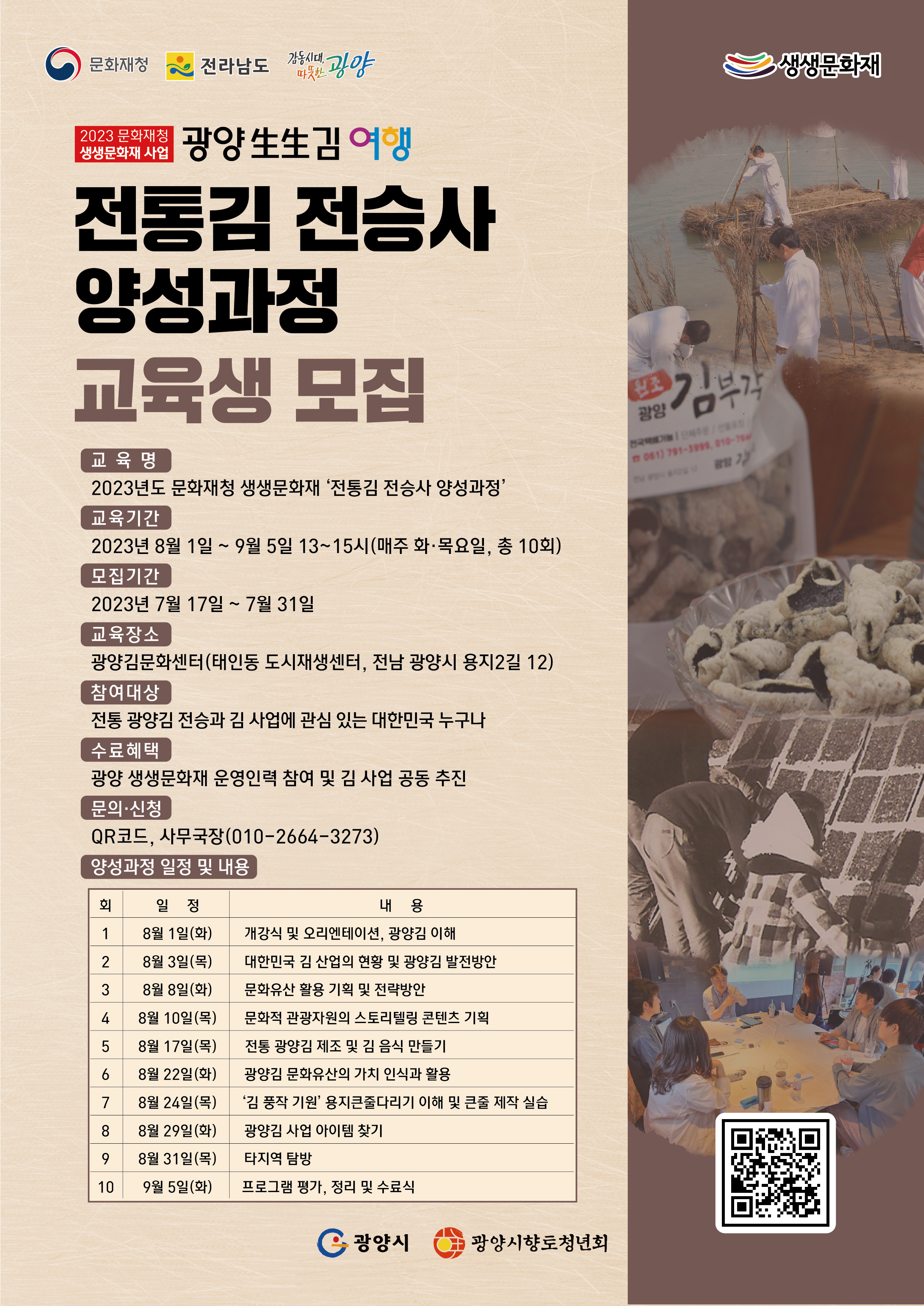 ‘전통김 전승사 양성과정’은 광양시향토청년회가 주관하는 2023년도 문화재청 공모사업인 생생문화유산 「광양 生生 김 여행」 사업의 두 번째 프로그램이다.